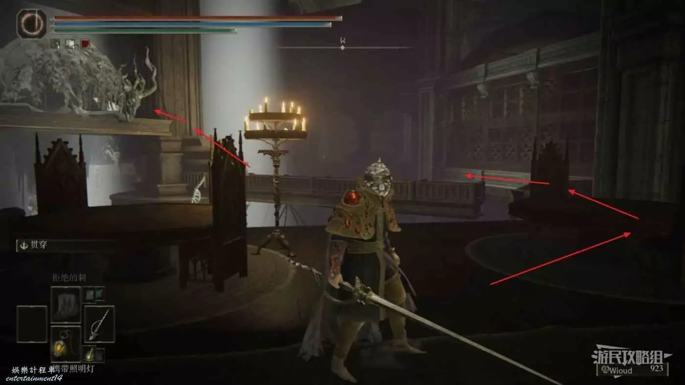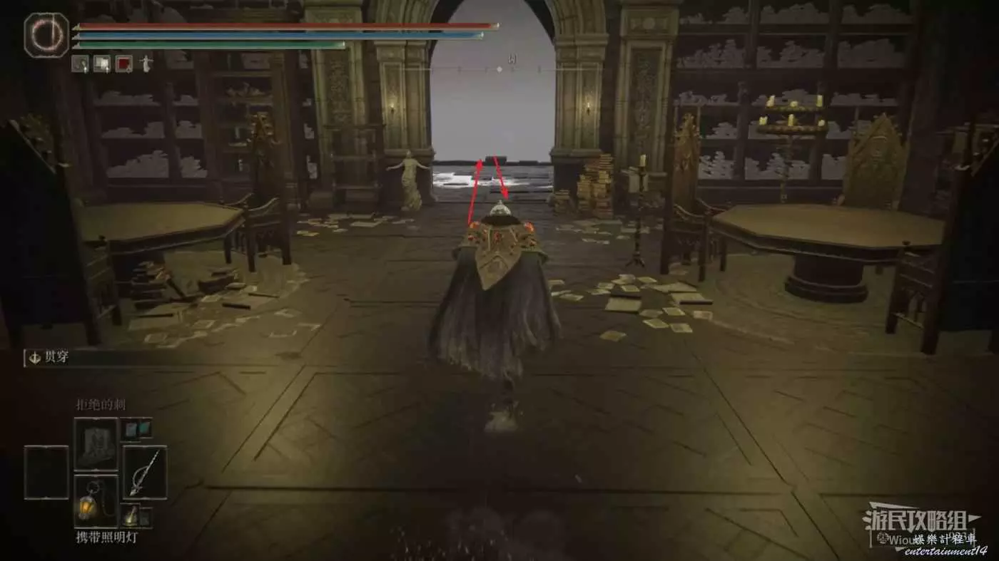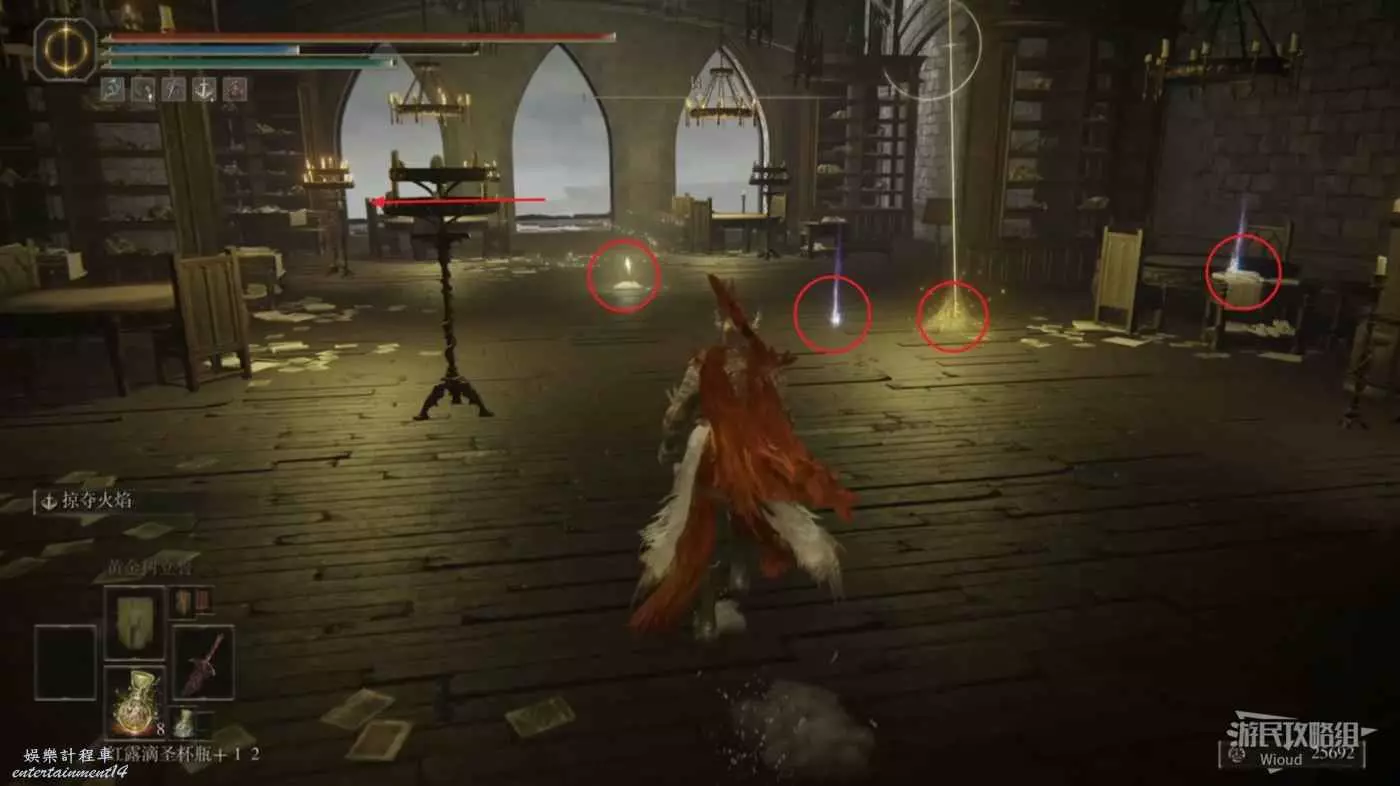 左側區域正前方的屍體可以拾取一個【附繩王室魔力油脂】,接著爬左側的樓梯進入某個2樓房間內,裡面有兩個敵人。