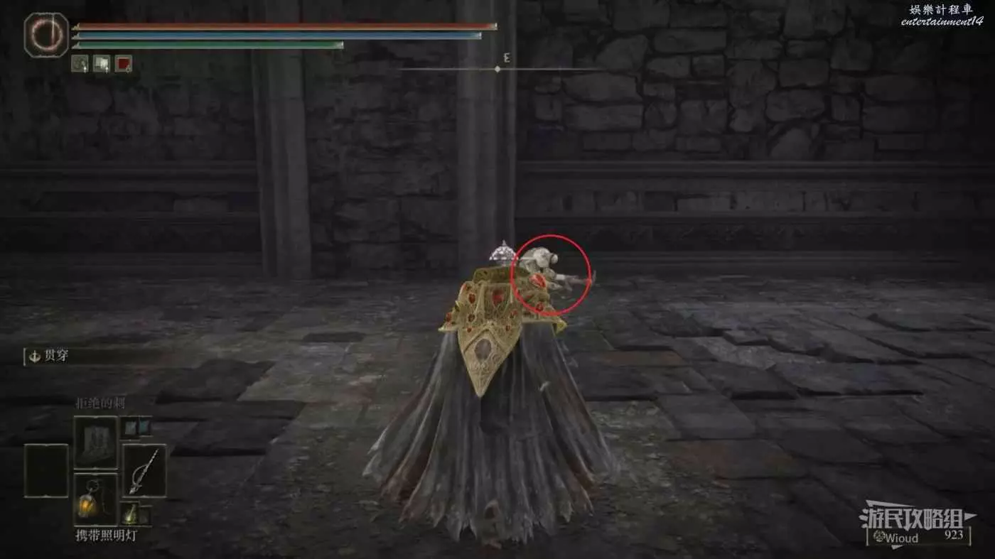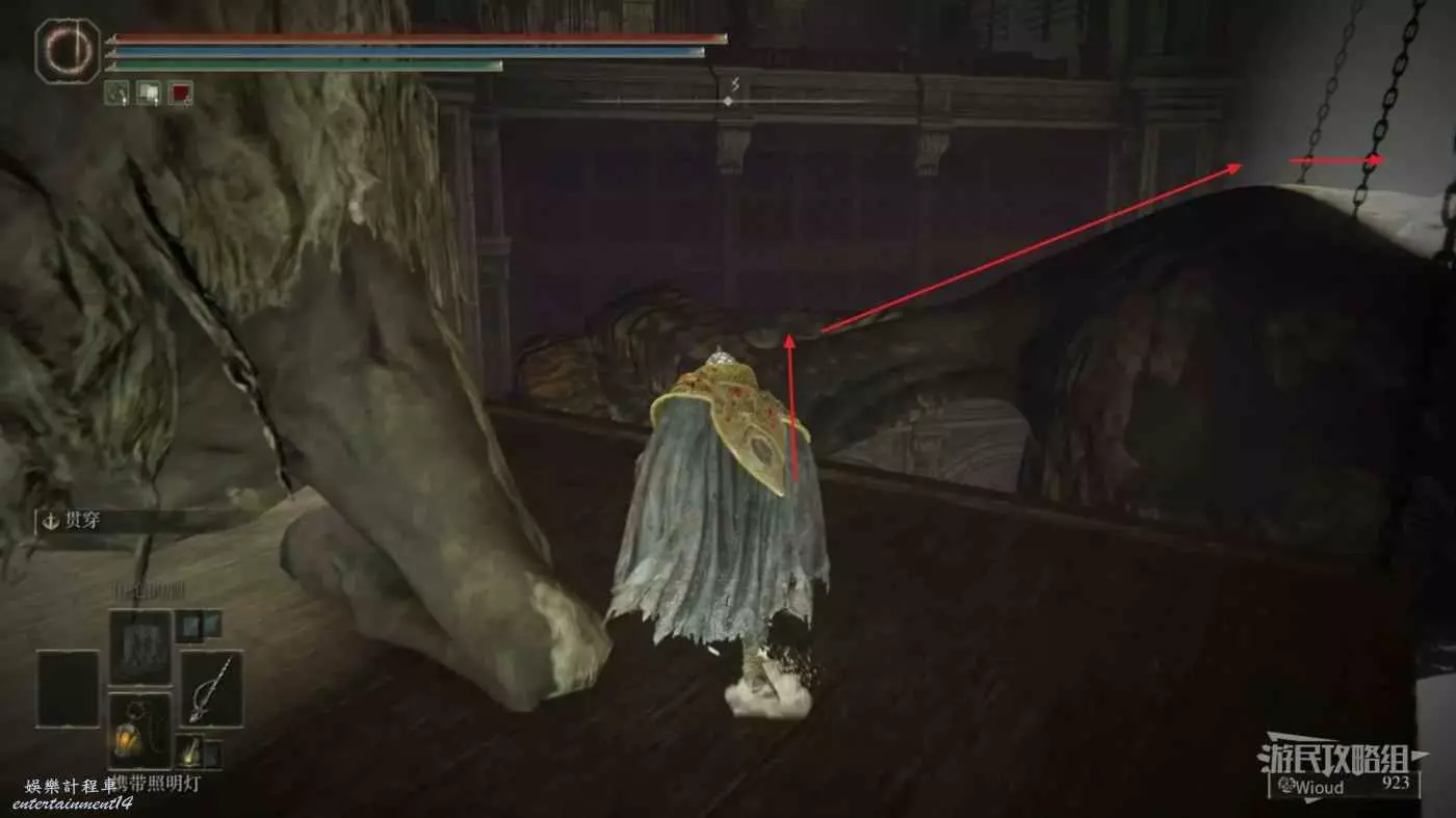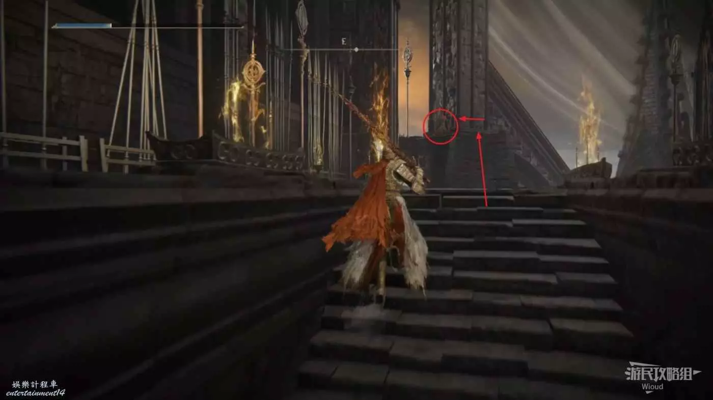 所以要加快趕路,否則死一次我們就會回到另一邊的賜福點,離得很遠,此時不要管兩個火焰騎士,直接繞過樓梯往左走到盡頭,可以看到盡頭處的機關,撥動這個機關。