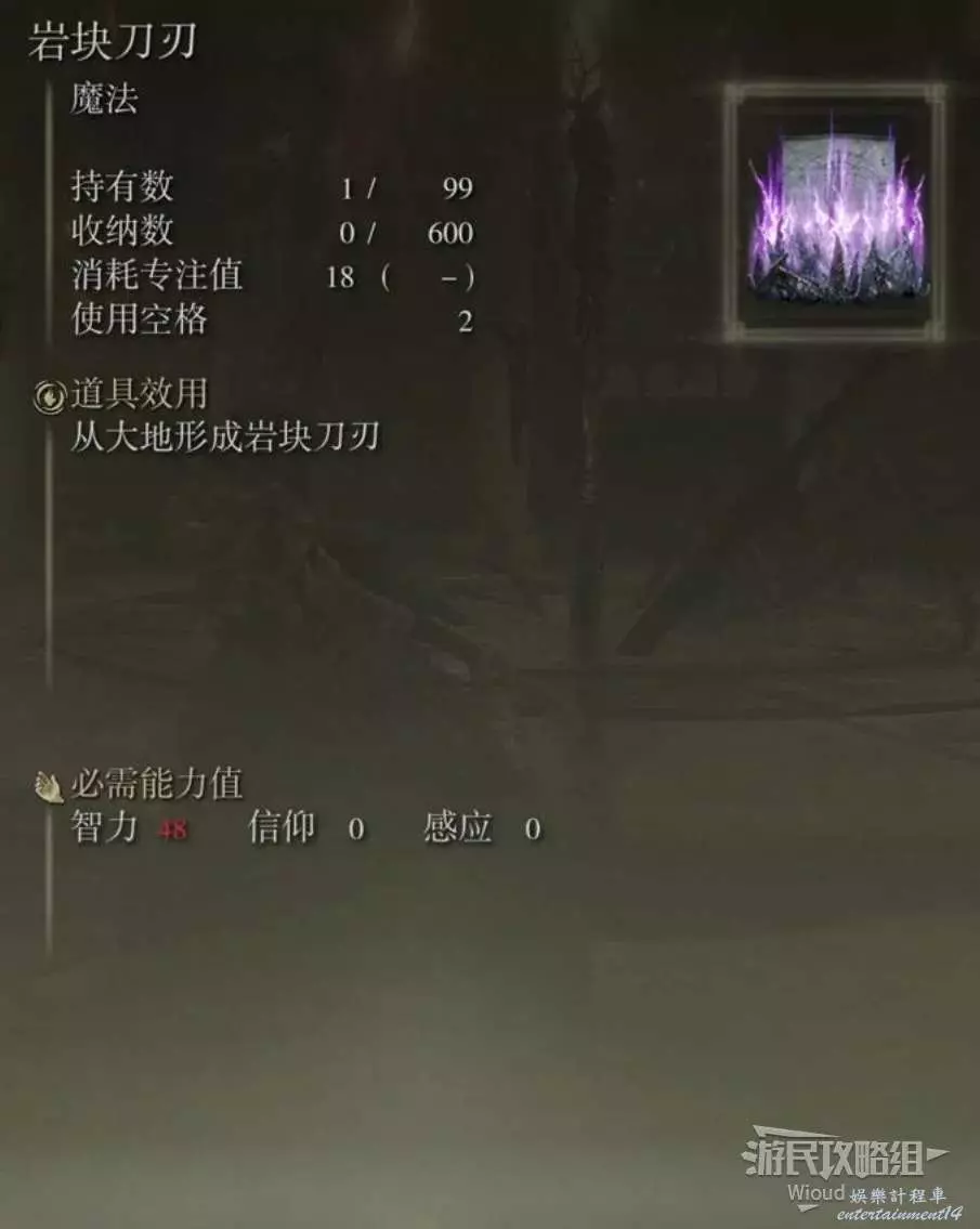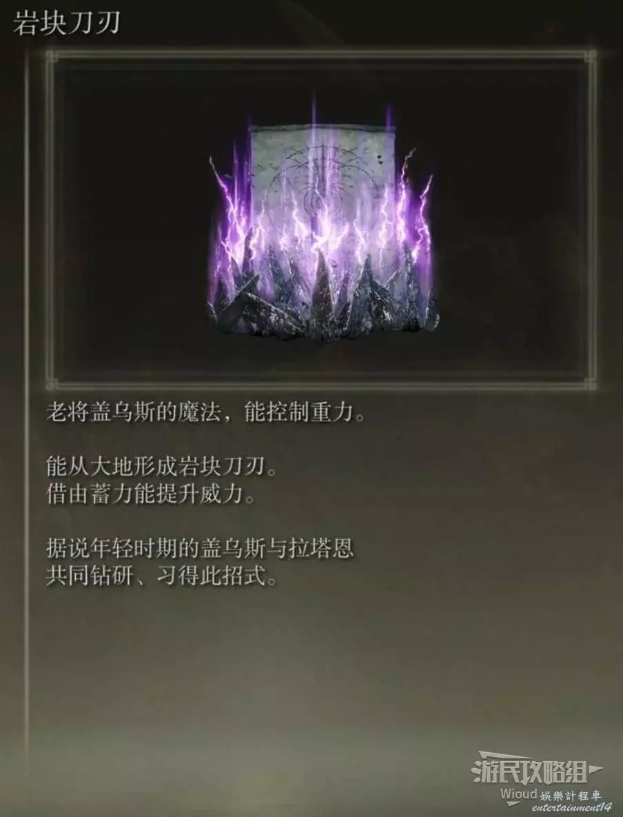 擊敗老將蓋烏斯獲得追憶,回到大賜福即可使用追憶兌換魔法【岩塊刀刃】。