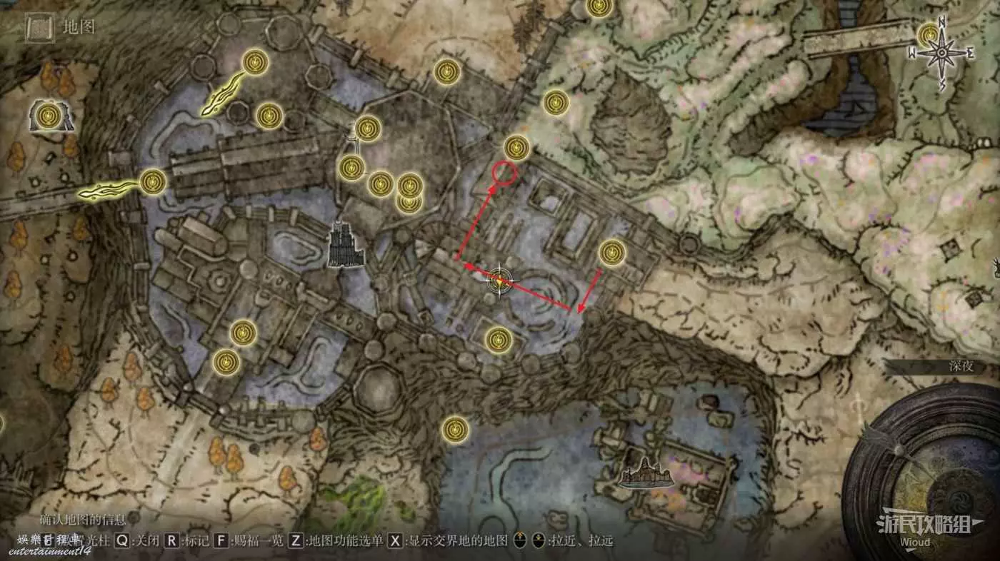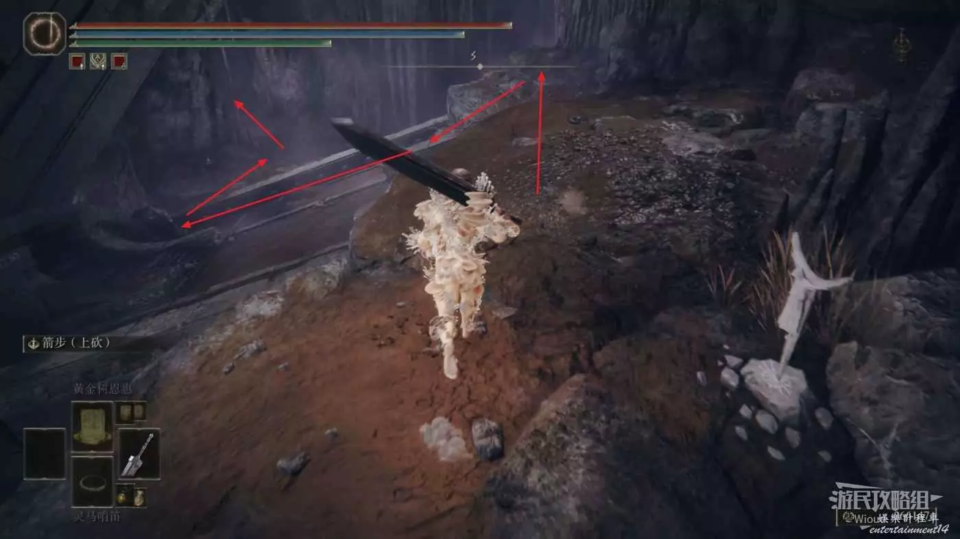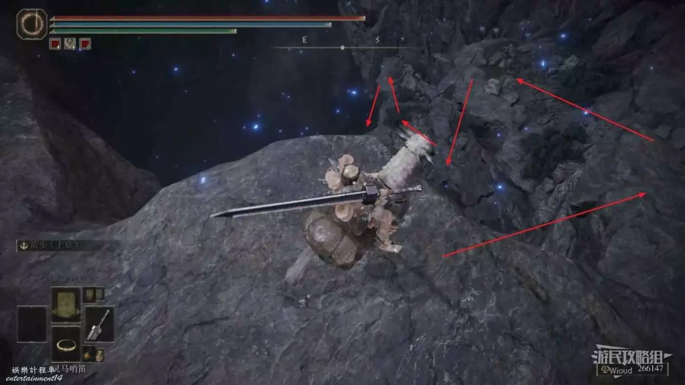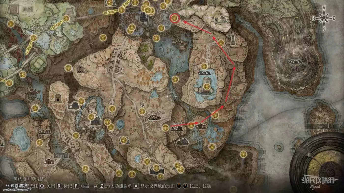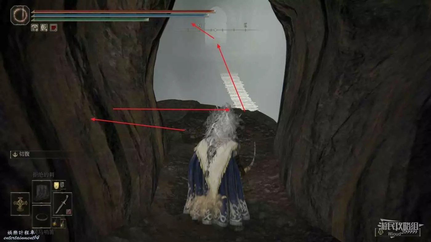 從賜福【穆斯廢墟】出發,按照下圖路線往右上角走穿過一個山洞到達山體的另一邊,然後往地圖左邊走經過賜福【古遺跡下方】。