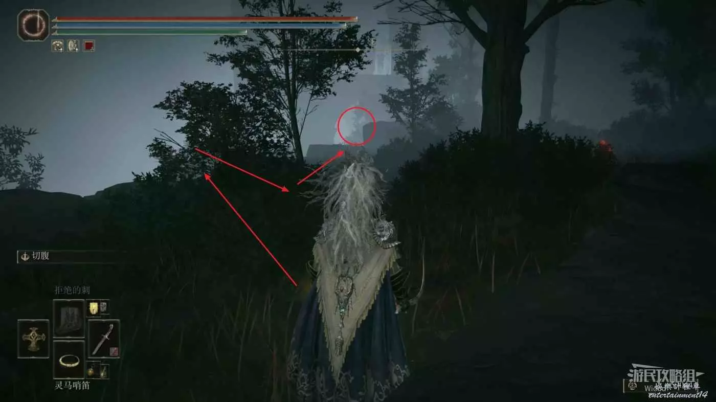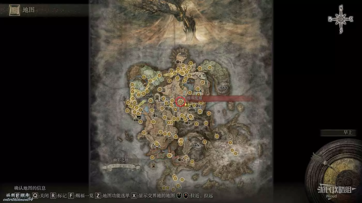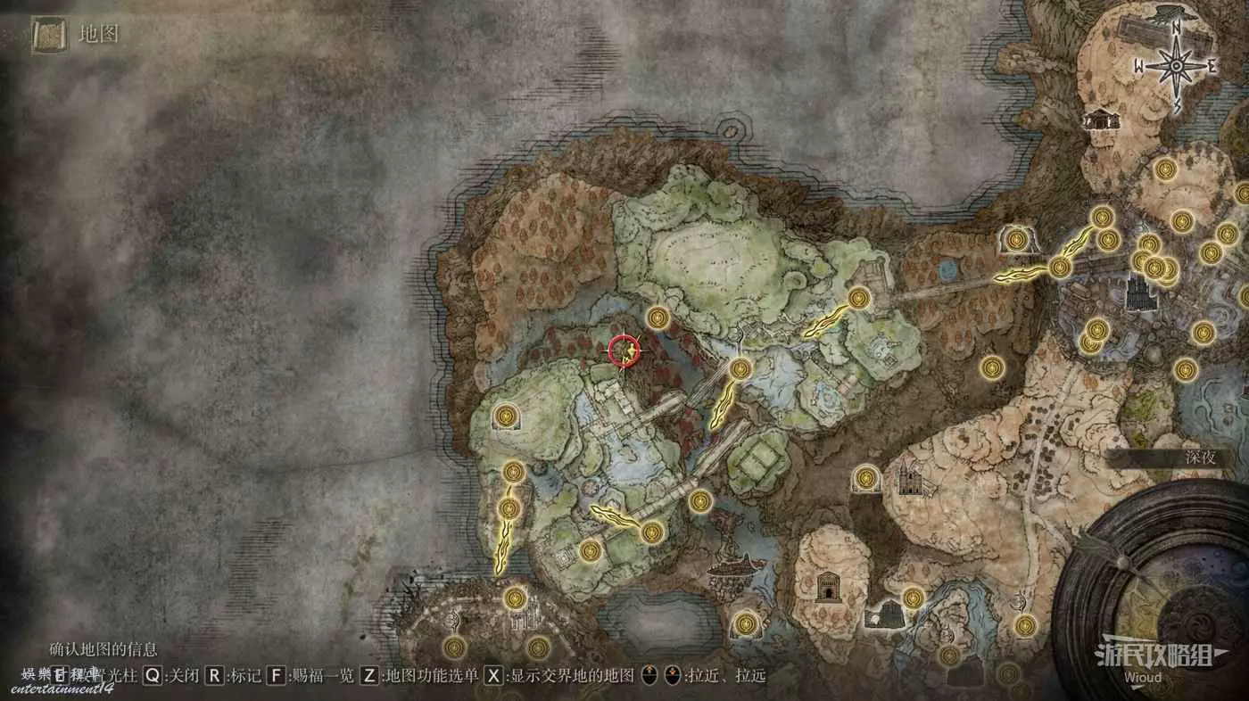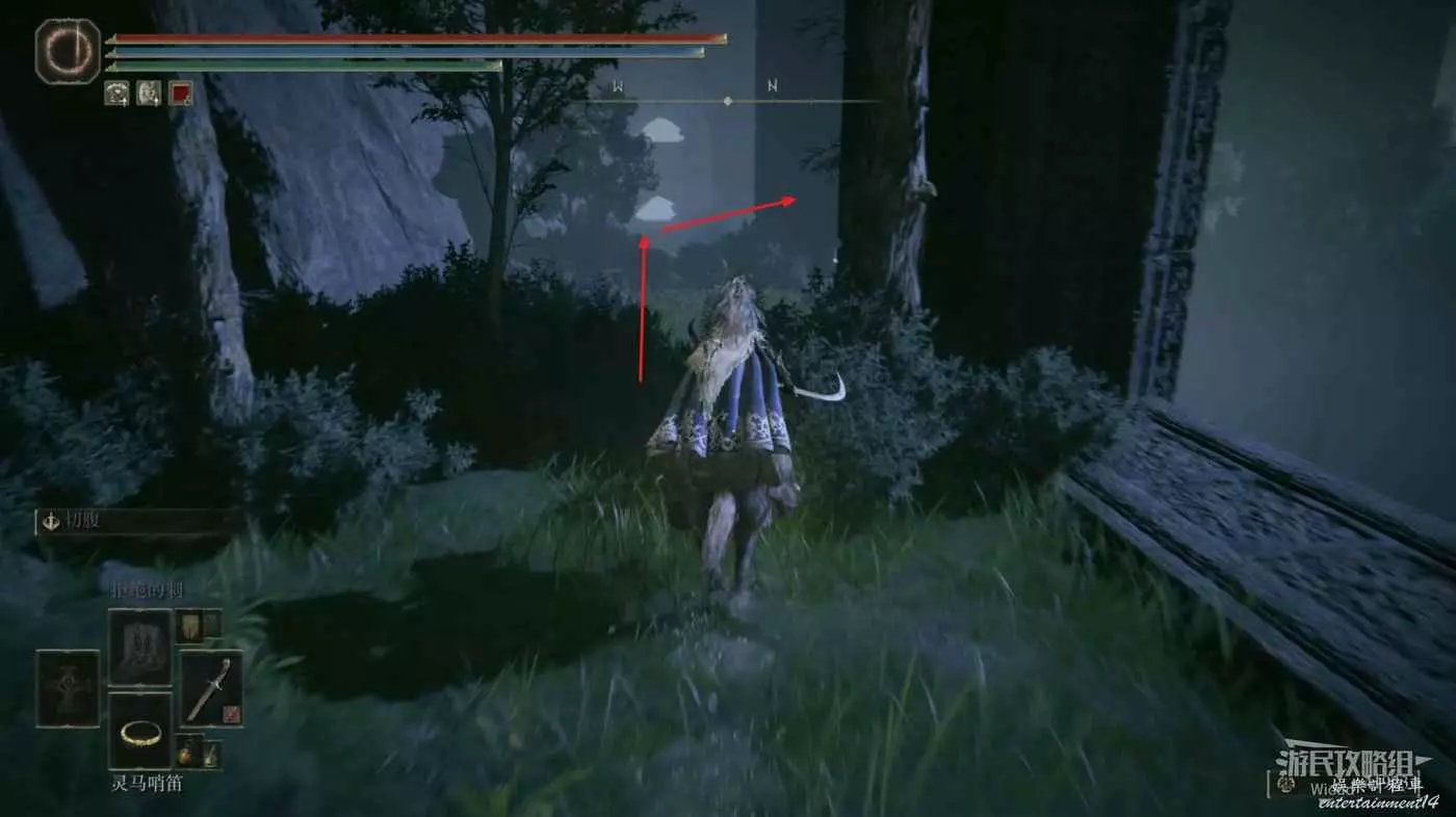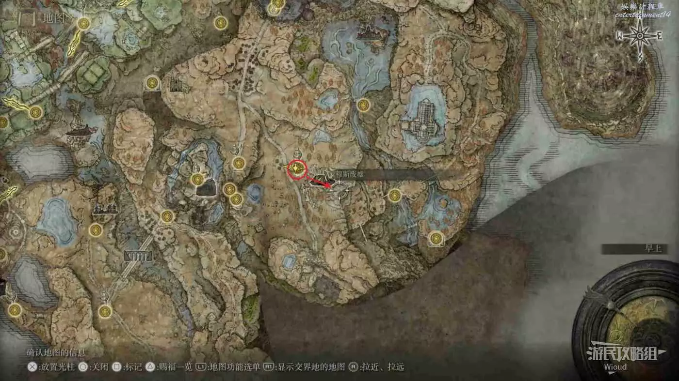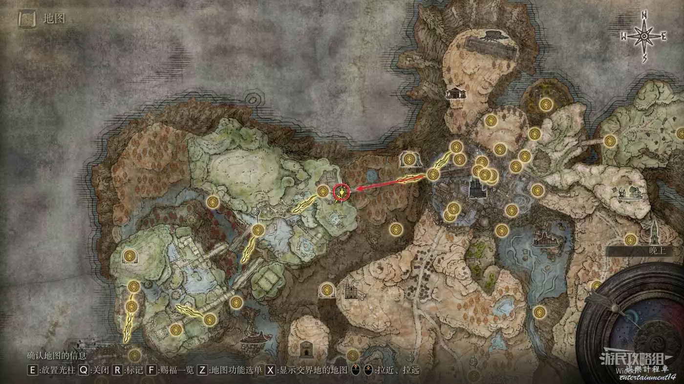 從賜福【穆斯廢墟】出發,按照下圖路線往右上角走穿過一個山洞到達山體的另一邊,然後往地圖左邊走經過賜福【古遺跡下方】。