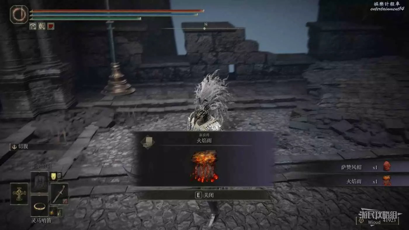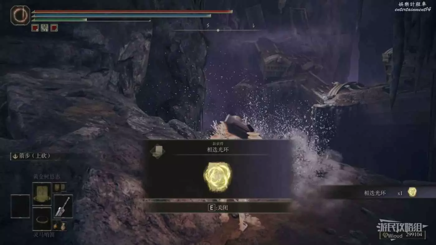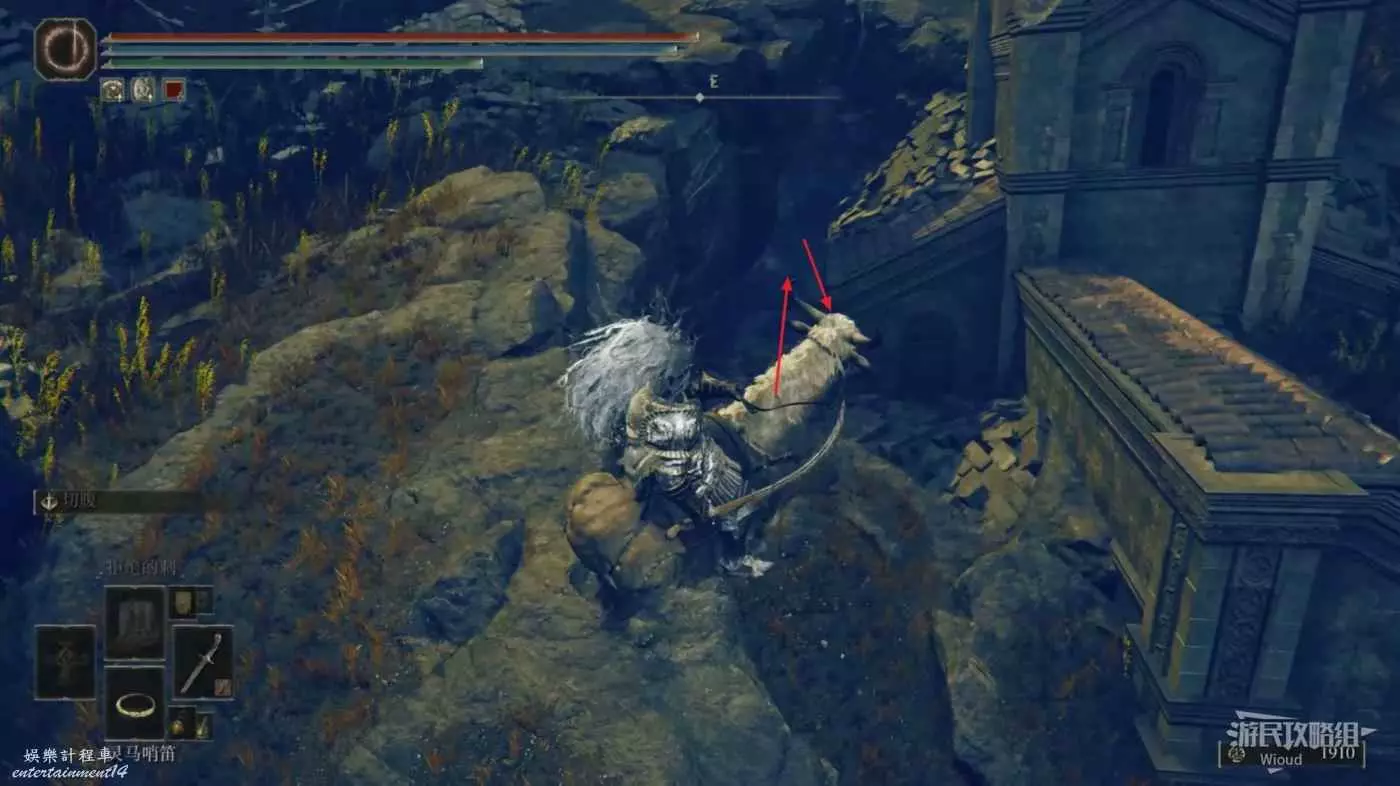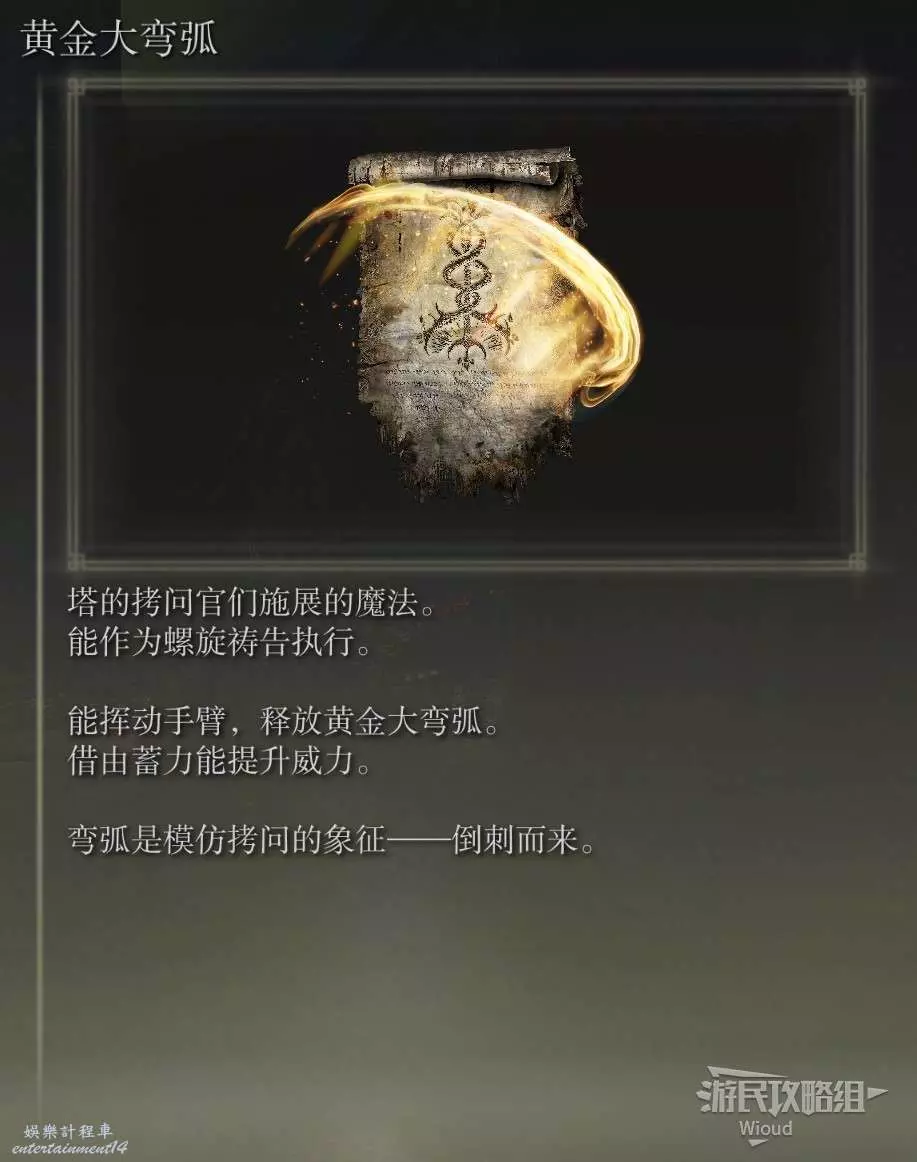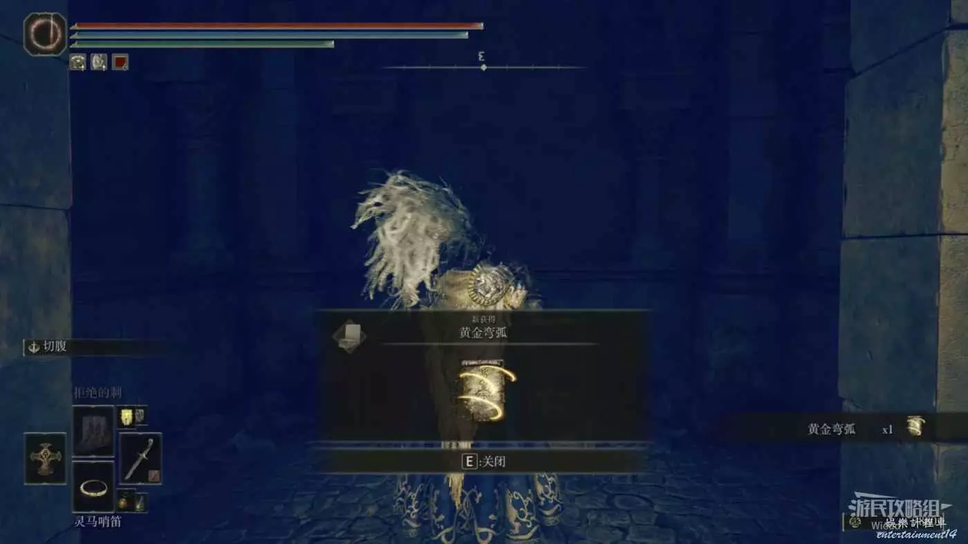隨後擊敗巨人,進入剛開始被它擋住的廢墟內部,打開前方建築內的寶箱即可獲得禱告【黃金大彎弧】。