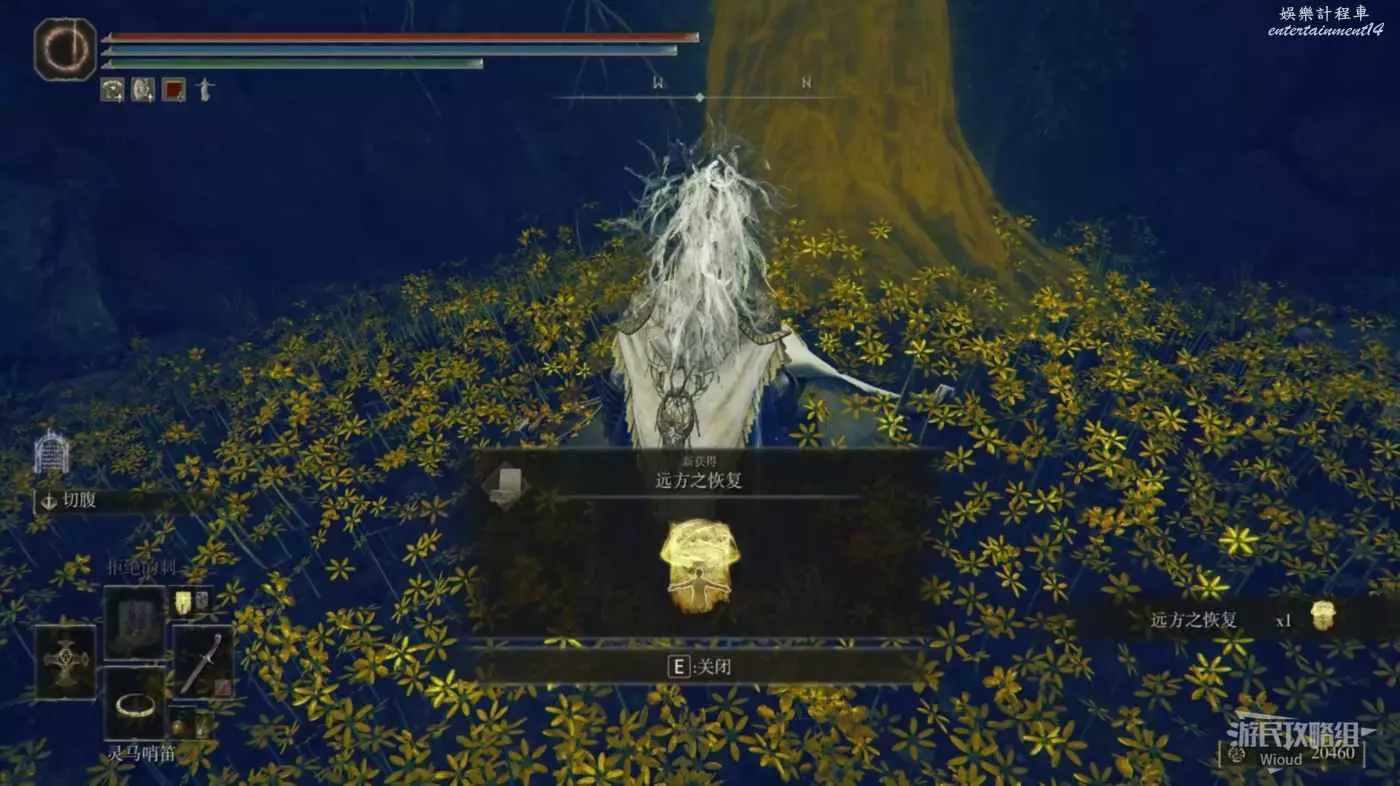 進入洞穴走不了多遠就能看到一個小黃金樹,擊敗周圍的三個調香師並拾取前方的光點即可獲得禱告【遠方之恢復】。