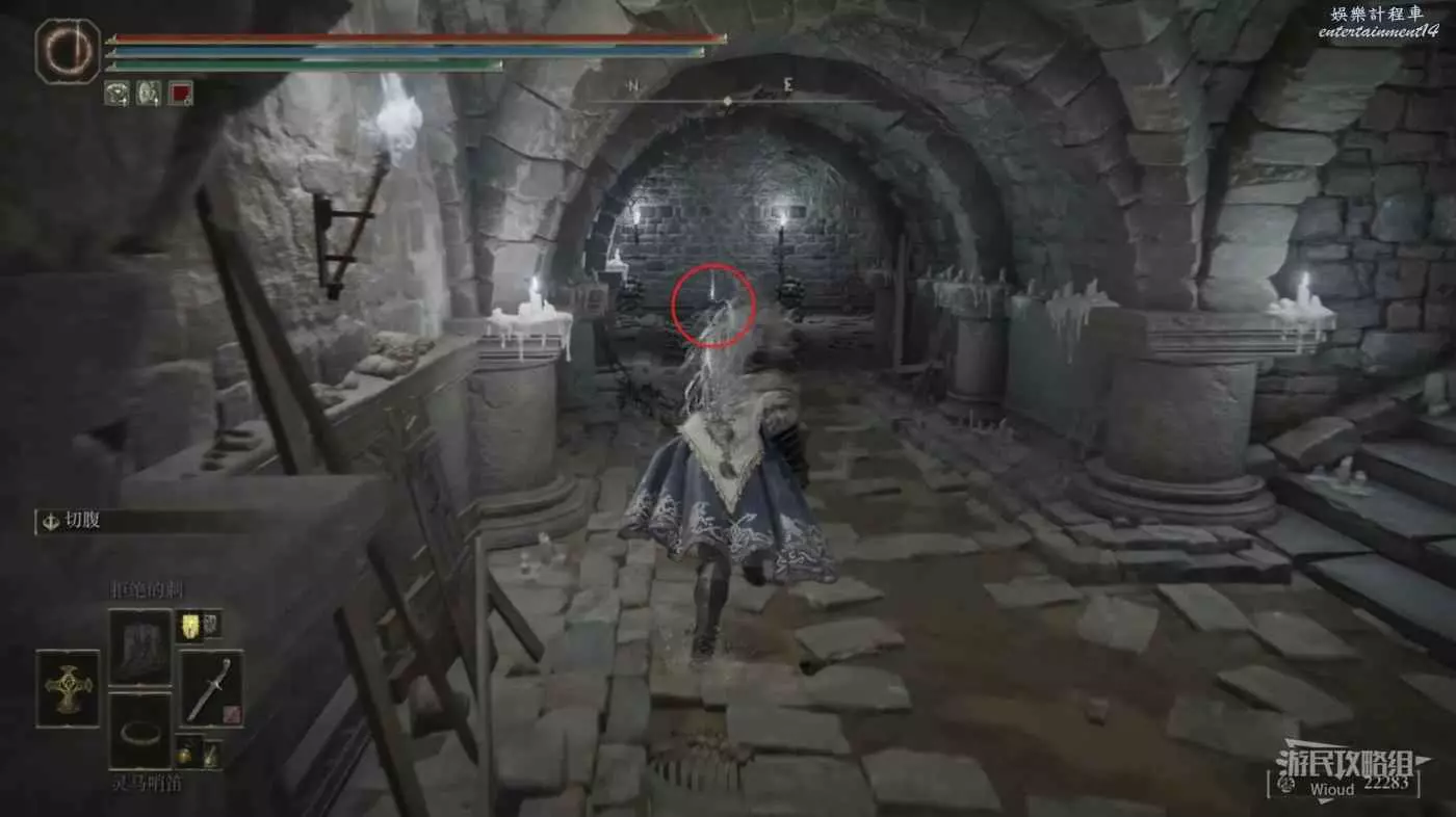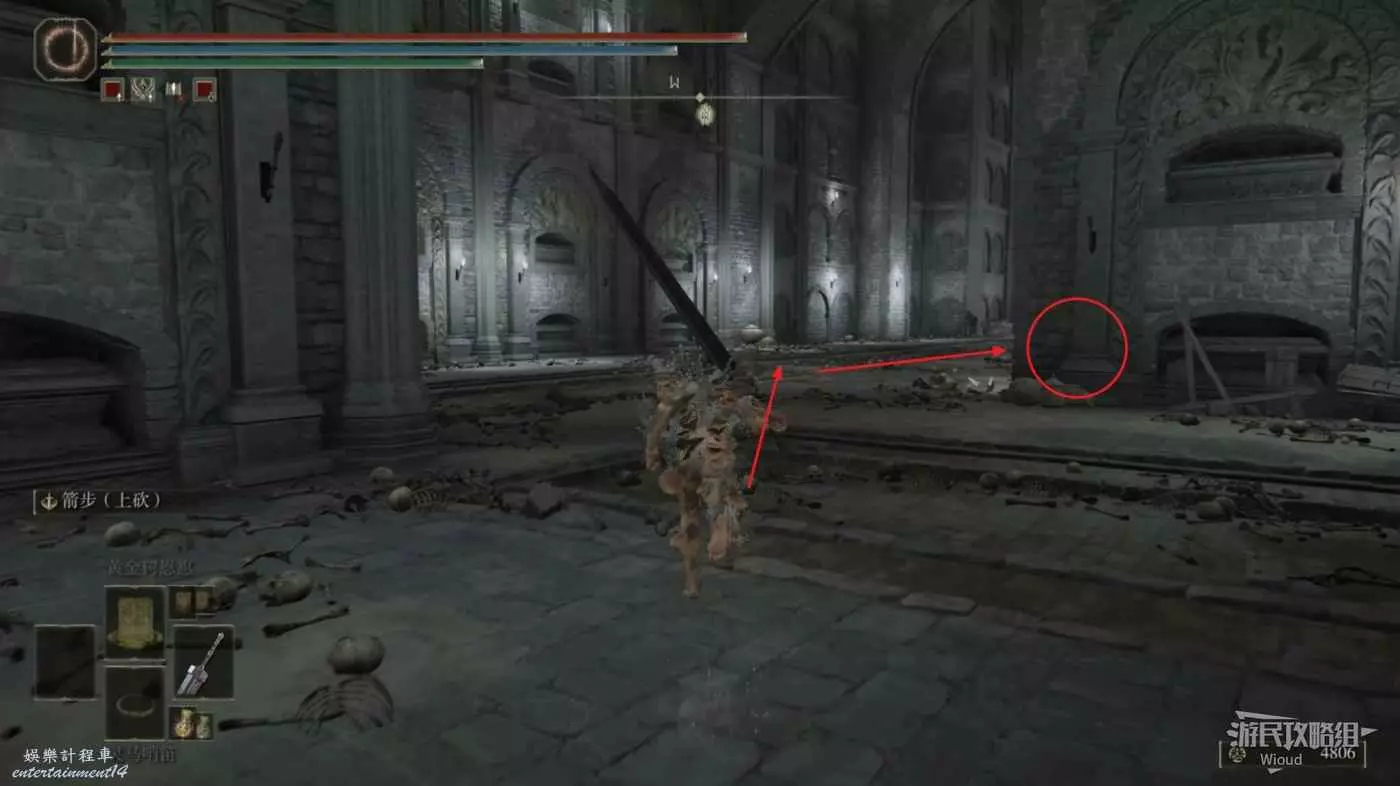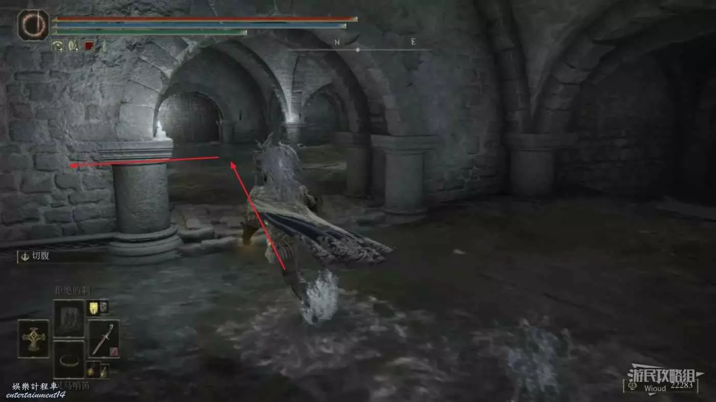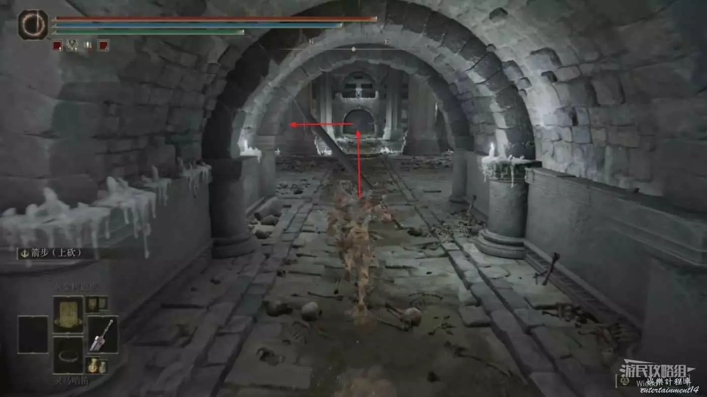 從地下墓地開始出門左轉,躲避怪物的攻擊直走到盡頭繼續左轉。