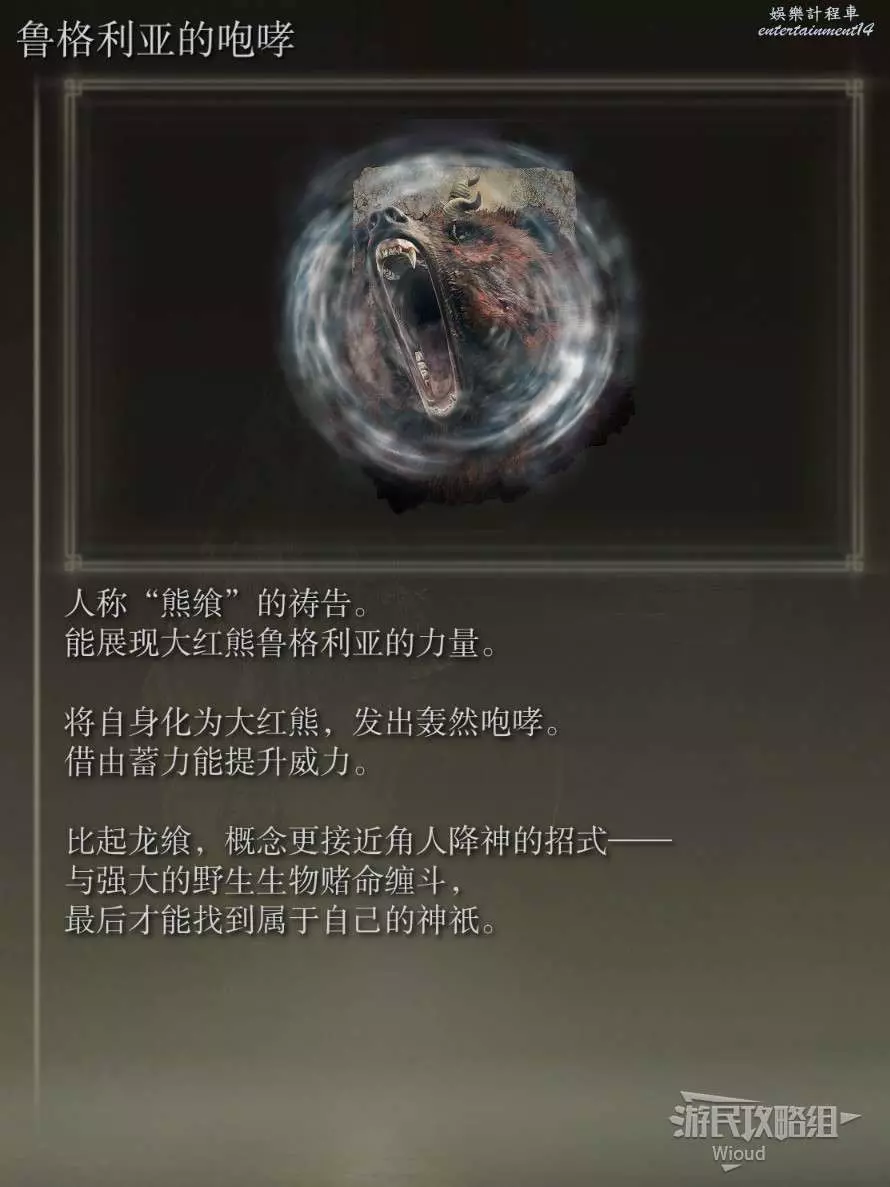 擊敗地圖左上角的大紅熊魯格利亞即可獲得這個禱告,從穆斯廢墟出發穿過右上洞穴按照下圖路線即可到達紅熊的位置。
