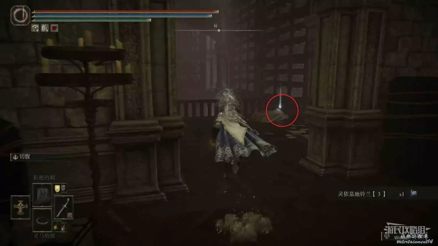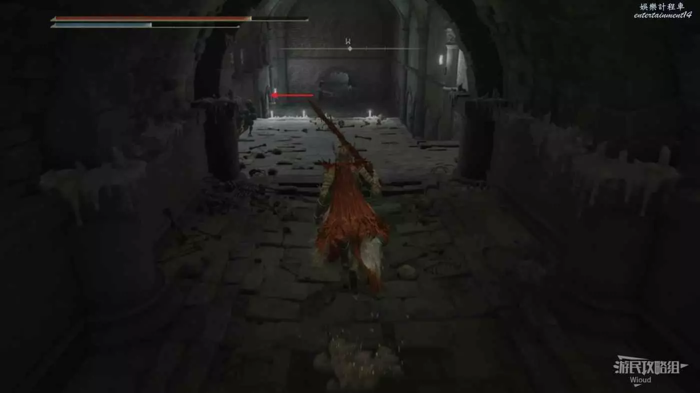 進入地下墓地先乘坐第一個升降梯往下走點亮賜福,接著往前走一段距離左轉來到一個大廳。