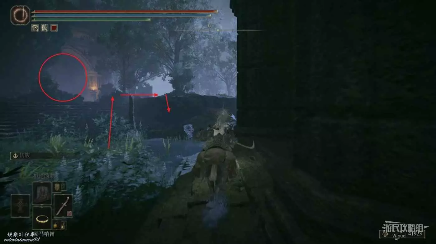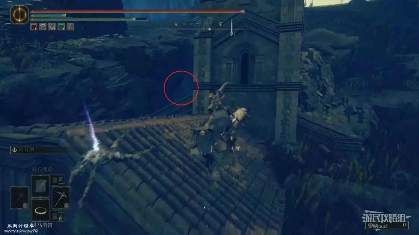 在下層的森林繼續往左下跳,在底層往右側的圓形建築遺跡走。