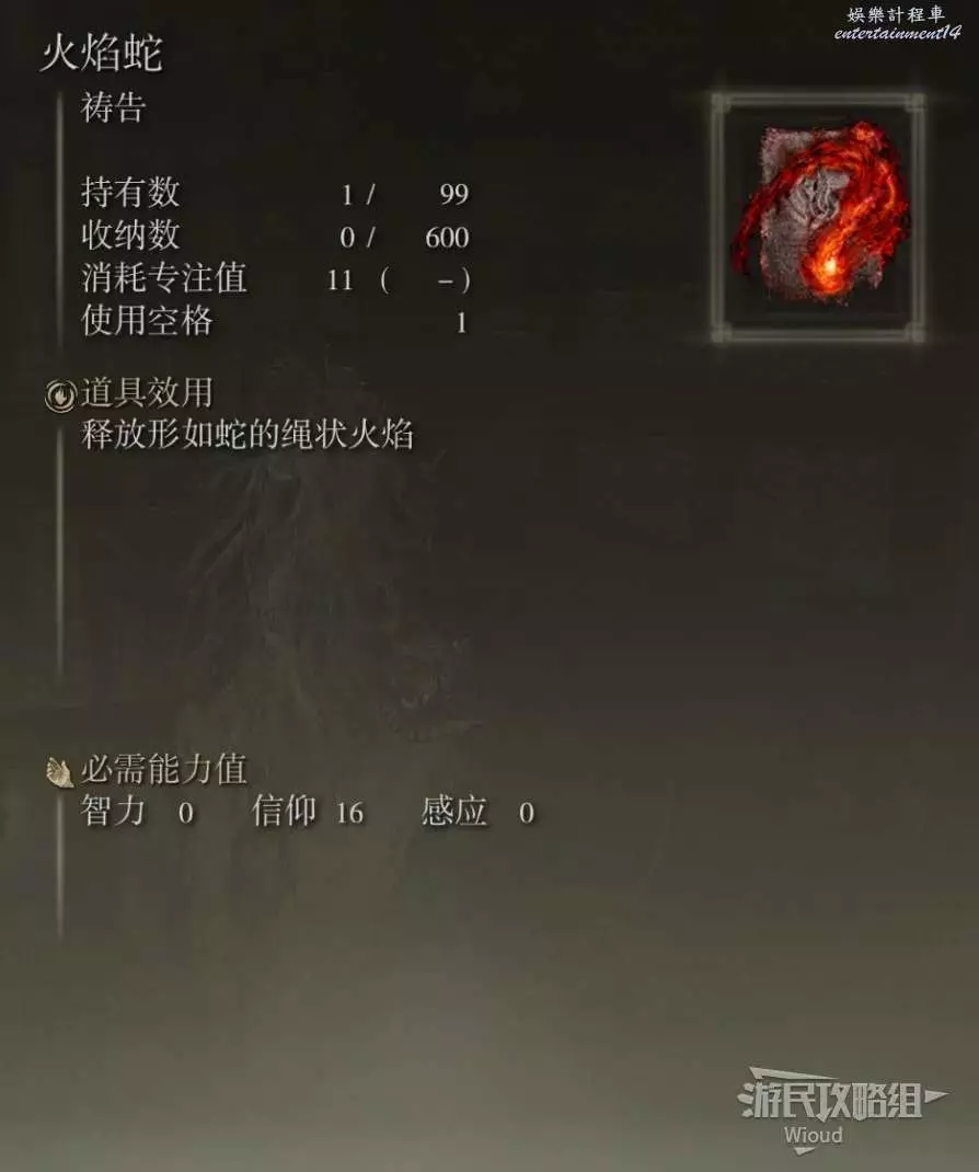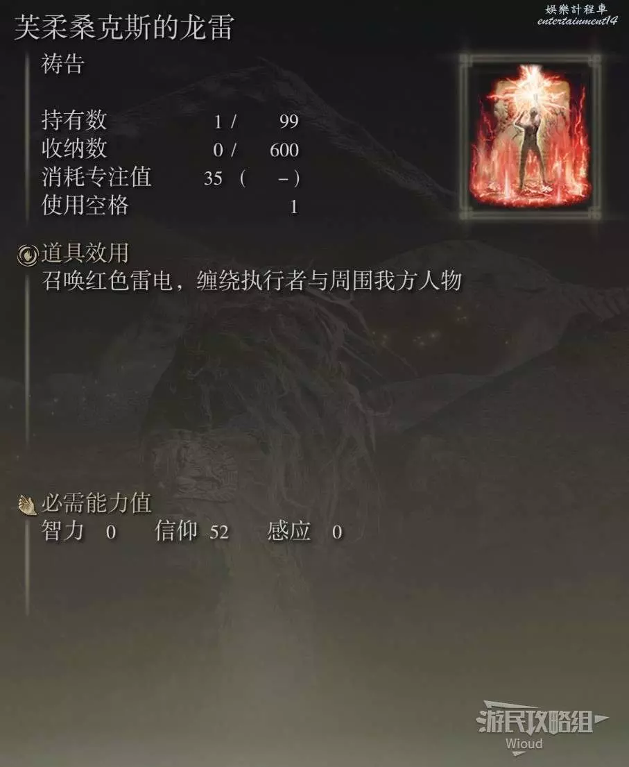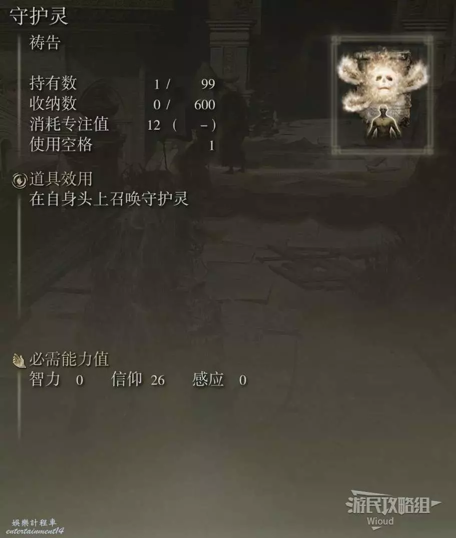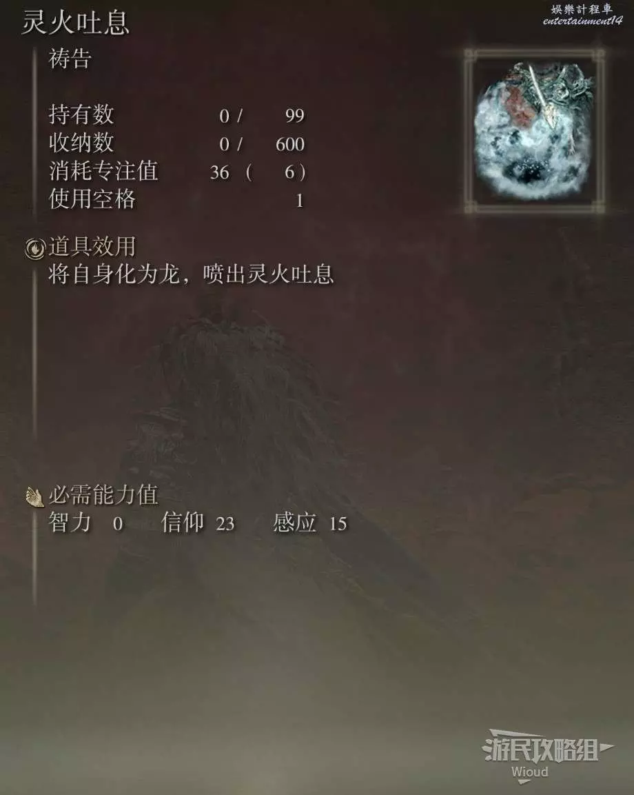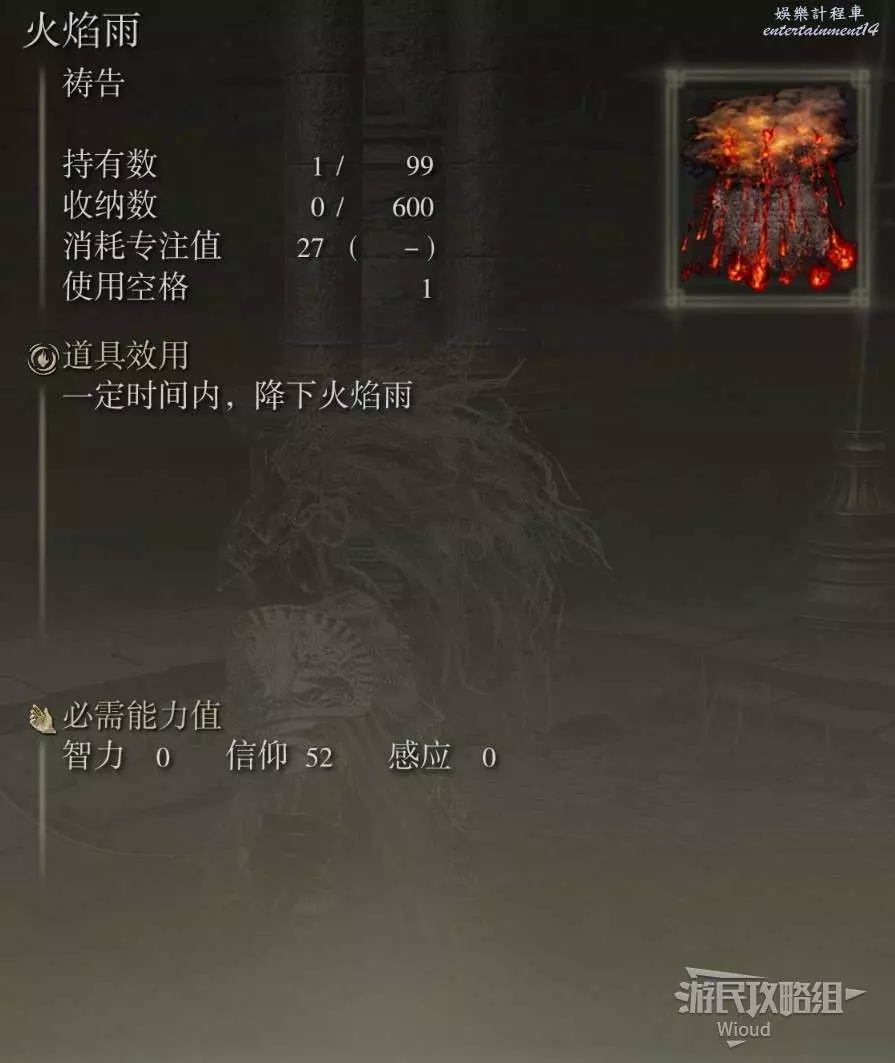 此禱告需要擊敗西邊城牆盡頭,勞弗古遺跡入口前的火焰騎士獲得。