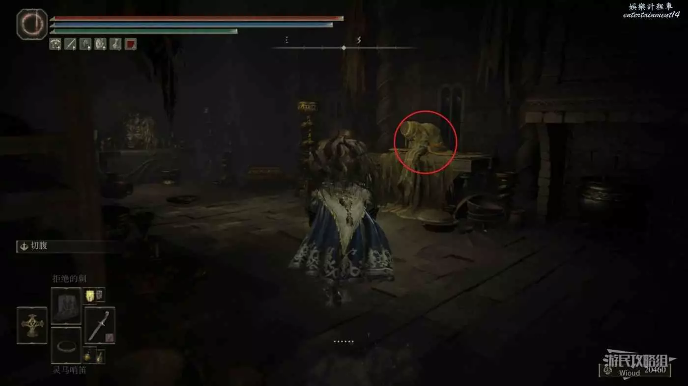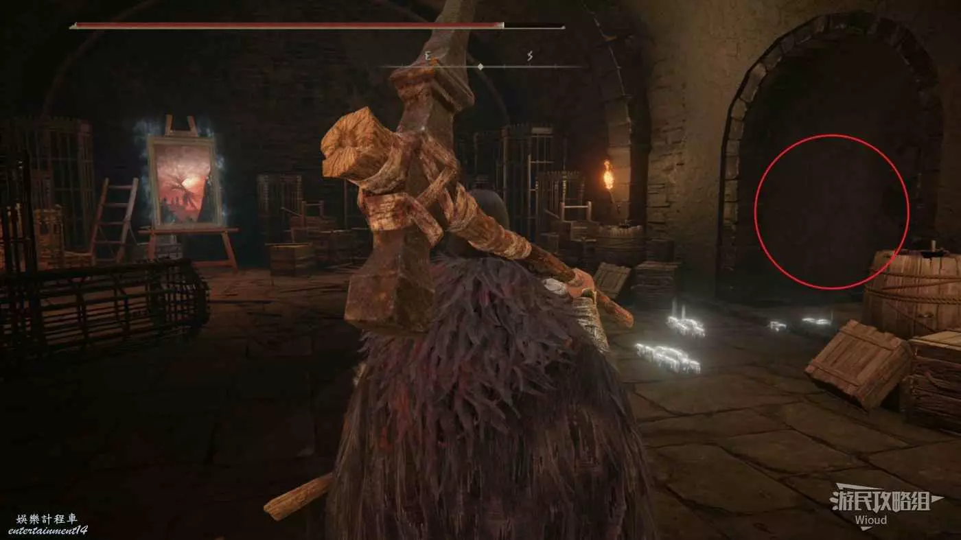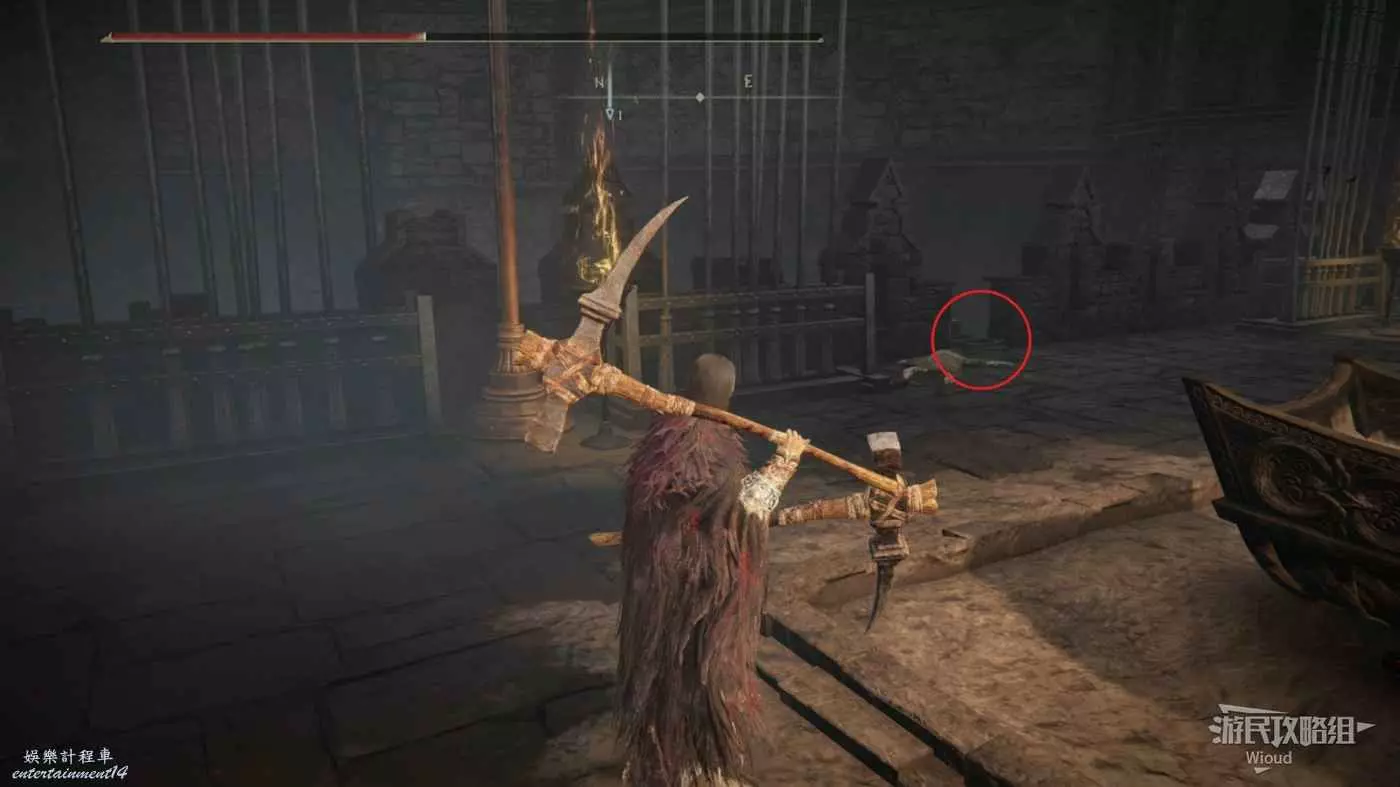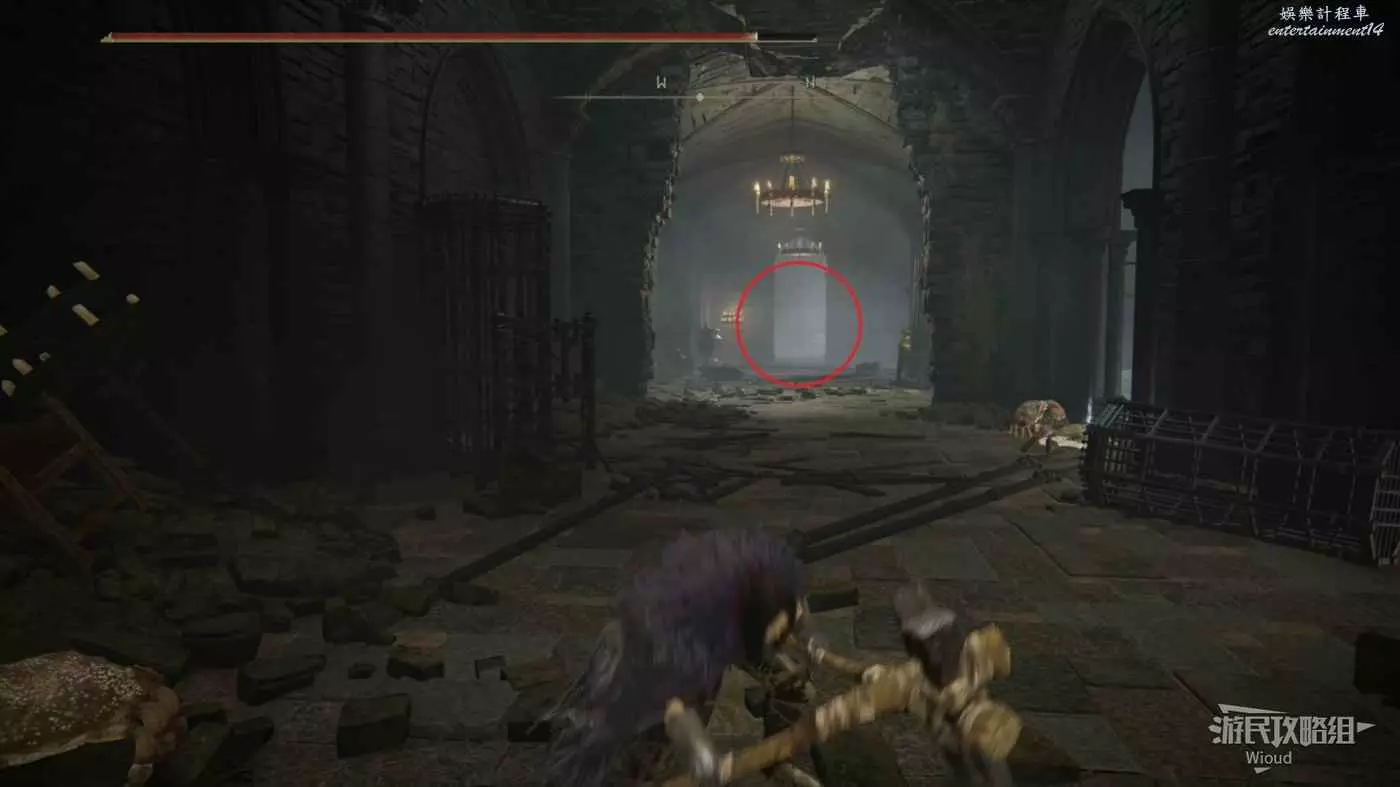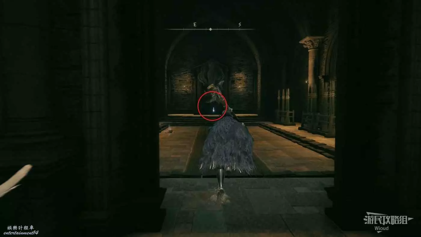 隨後返回賜福【教區入口】,直接從樓頂跳到地面,然後從腐敗樹廣場進入中間的教堂,在教堂內繼續往右邊走。