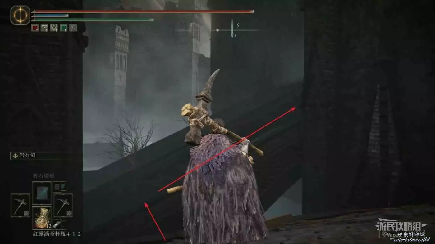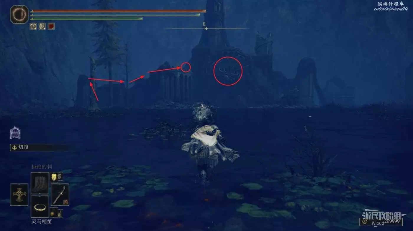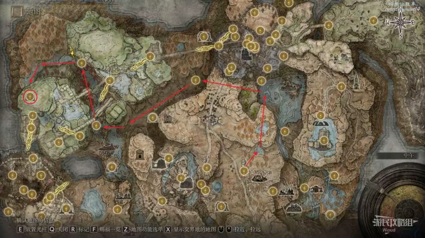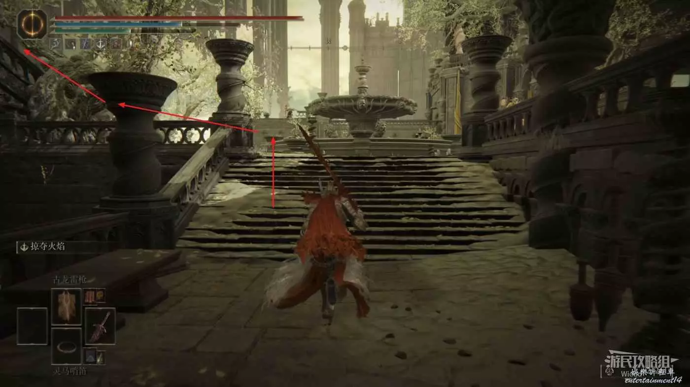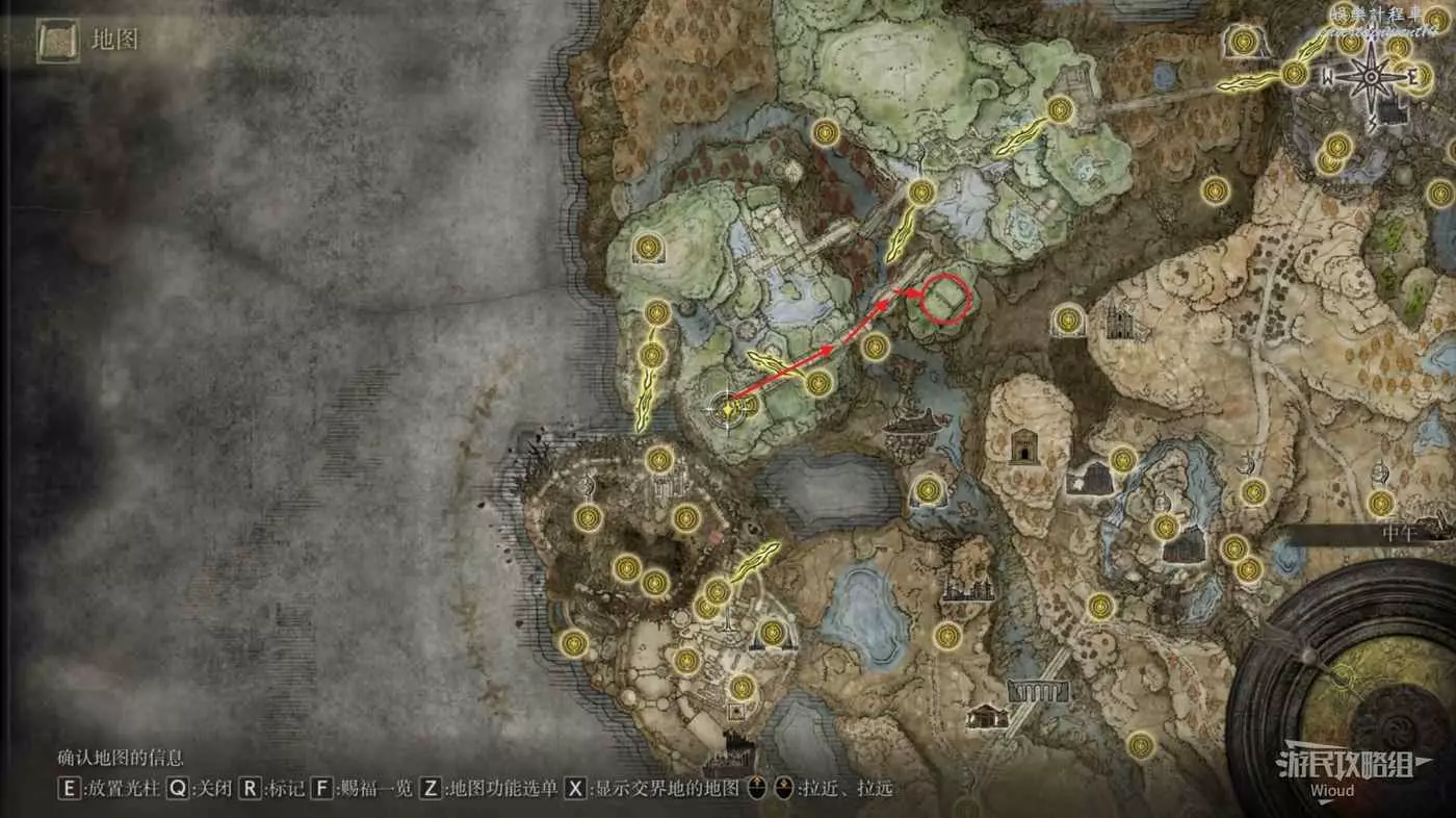 然後從賜福點出發,按照下圖所示路線順著右前方的石橋走
