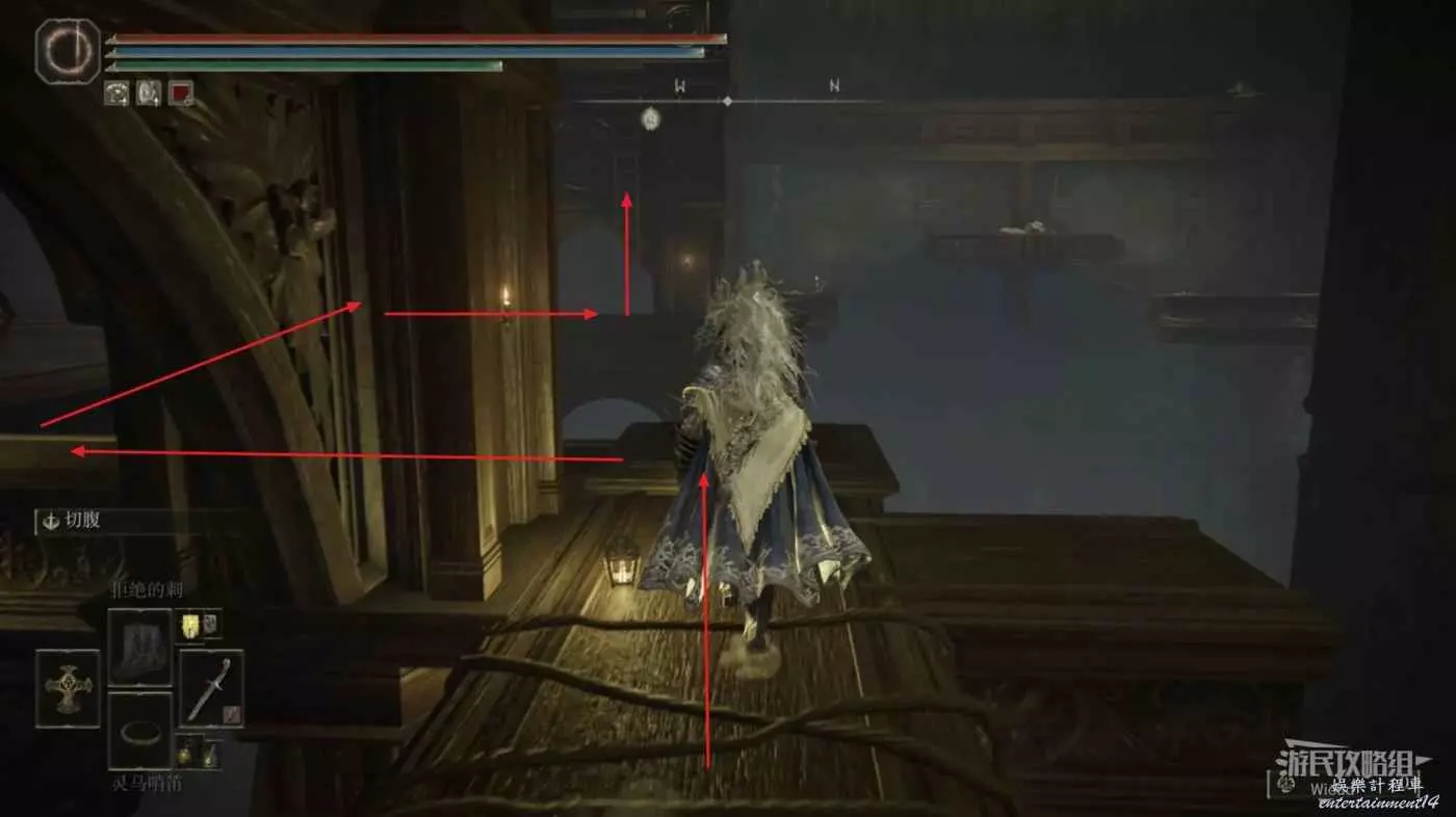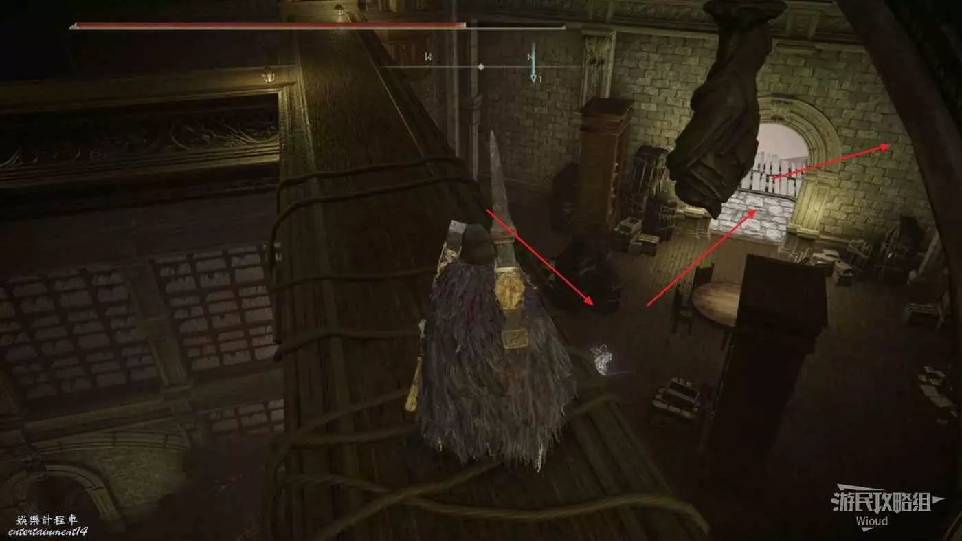 從賜福【保藏庫(閣樓)】出發,乘坐升降梯來到上方橫樑的位置,此時往左走,按照下圖路線爬前方的梯子到上層。