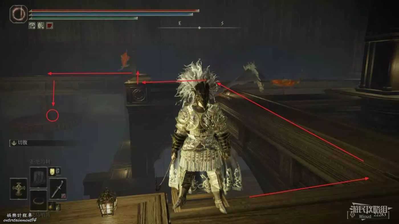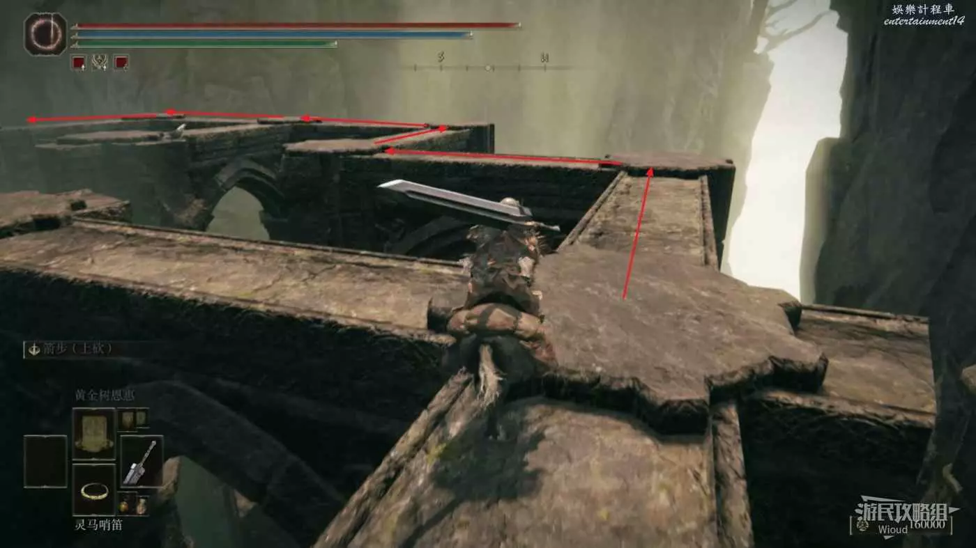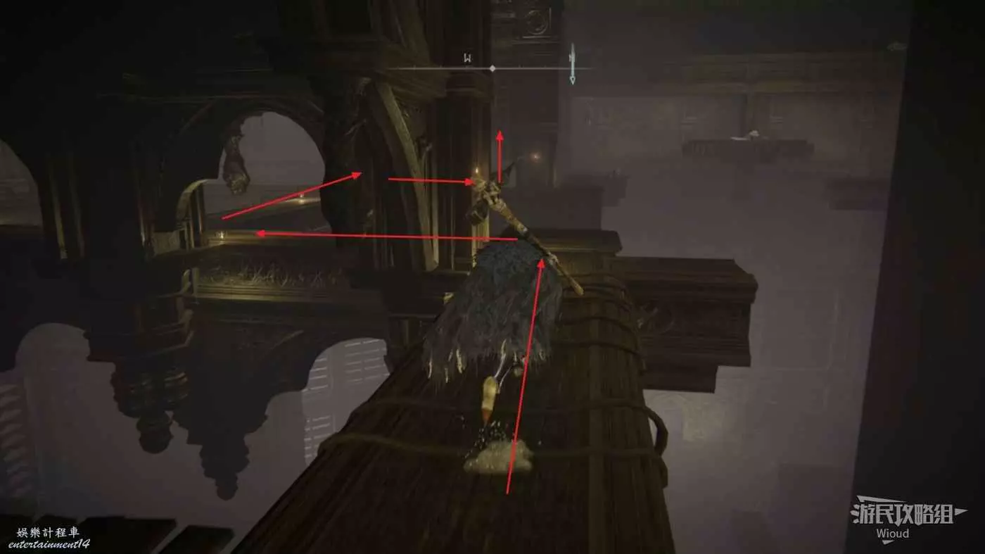 來到橫樑上層沿著下圖路線繼續在橫樑上走,注意右側第二個拐角位置需要跳一下,如果掉下去還得重新按照剛才的路線跑一遍。