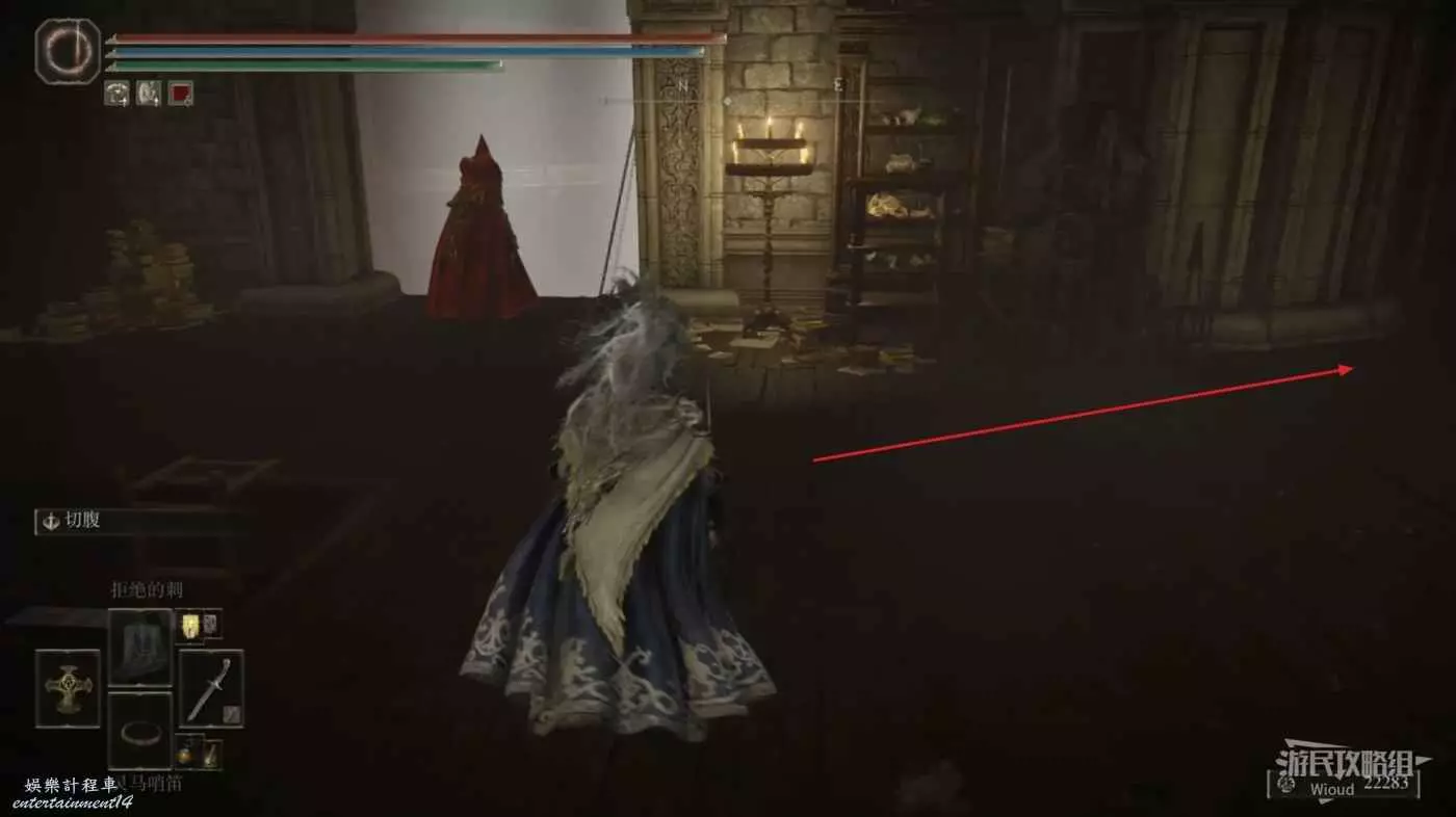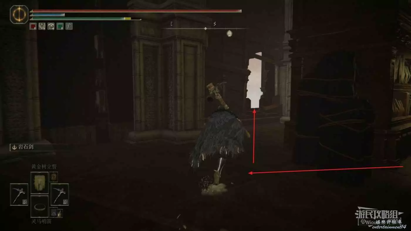 打開盡頭處的大門,乘坐升降梯往下走,在下層升降梯口啟動賜福【禮樹暗道】,然後繼續沿路往前走。
