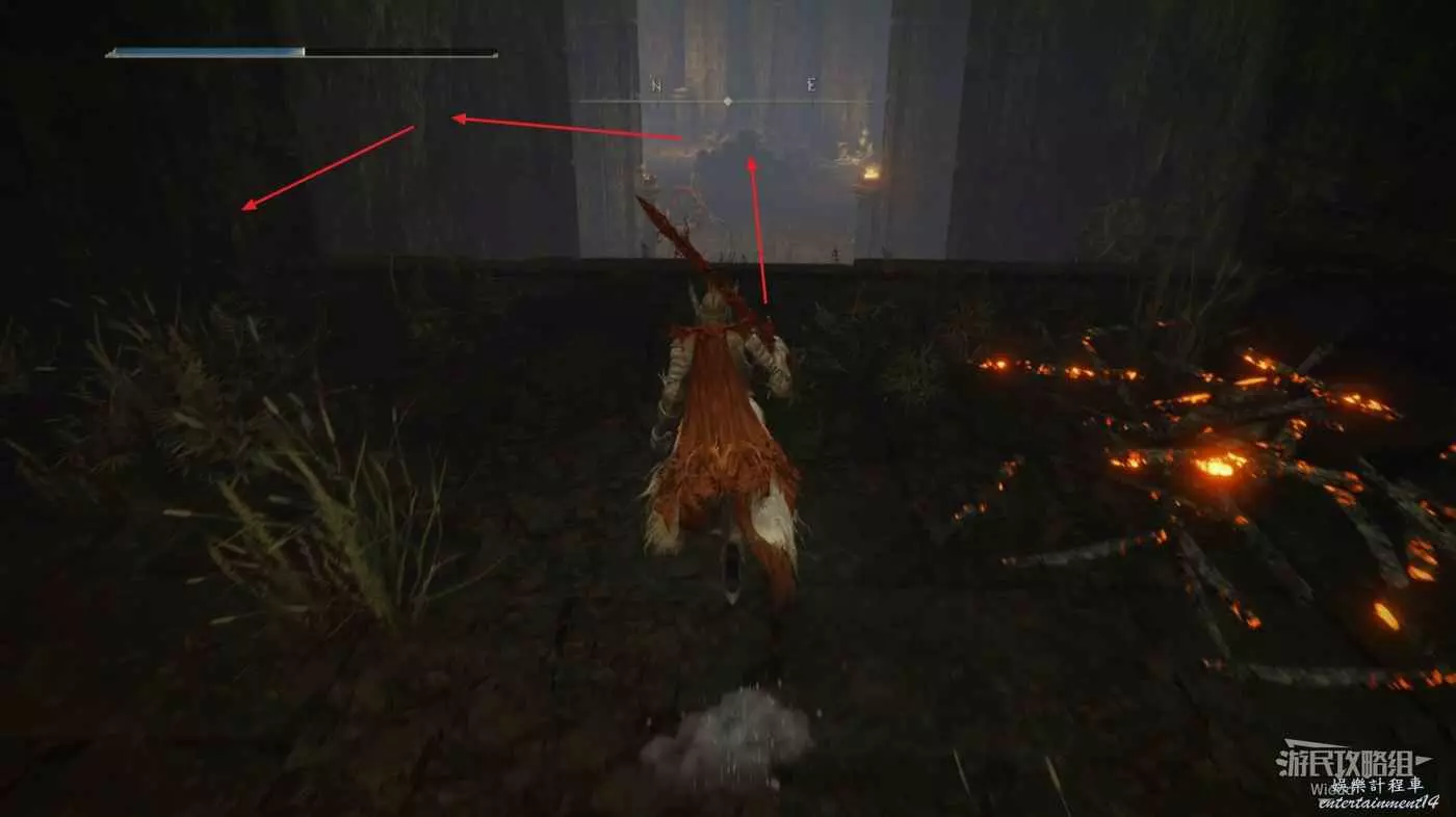 繞到火焰巨人背後的平地,往前E-S的中間方向走。