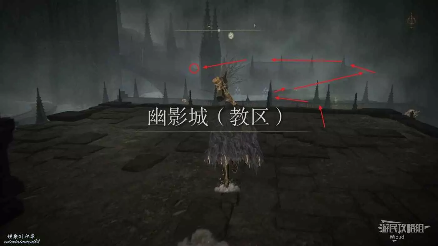 隨後沿著下圖所示路線一直走到【幽影城教區】。