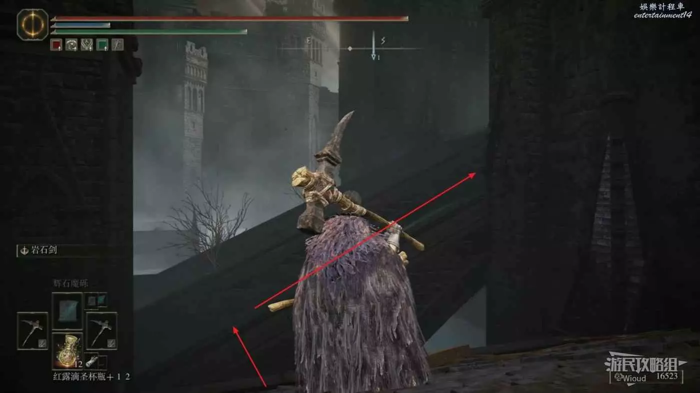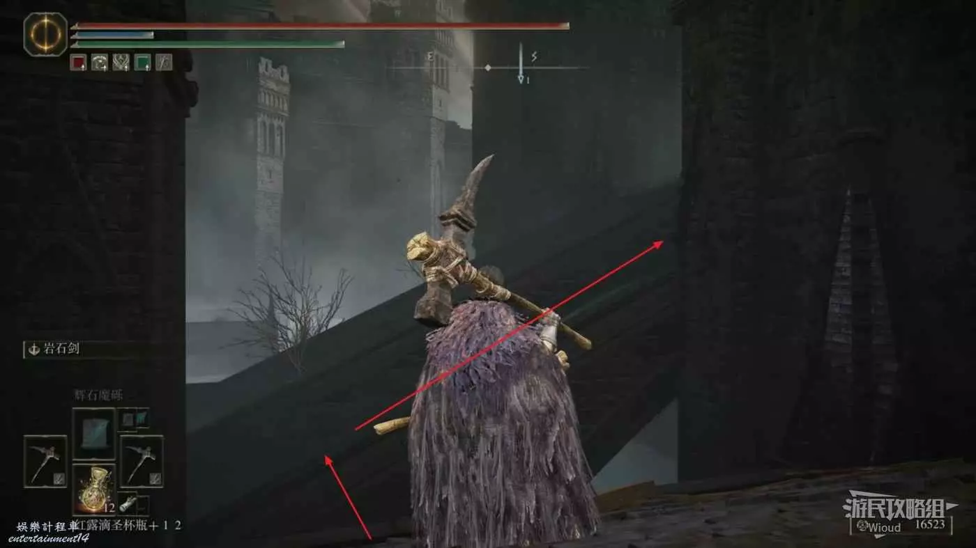 繼續往前走不了多遠就能看到安提廢墟,來到安提廢墟門口先繞到廢墟左後方,然後沿著破敗建築爬到右側高處,在這裡投擲一個大燃爐壺到巨人的頭部使其復活。