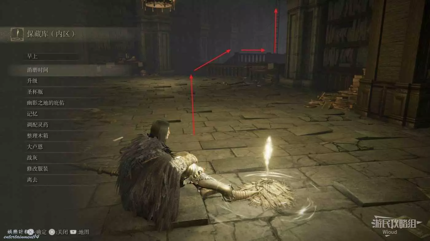 爬到第三層的位置,先走到前方小門的位置,此時往右後方看,通過此處的出口走到外側樓梯,沿著樓梯爬到上層啟動賜福【保藏庫(閣樓)】。
