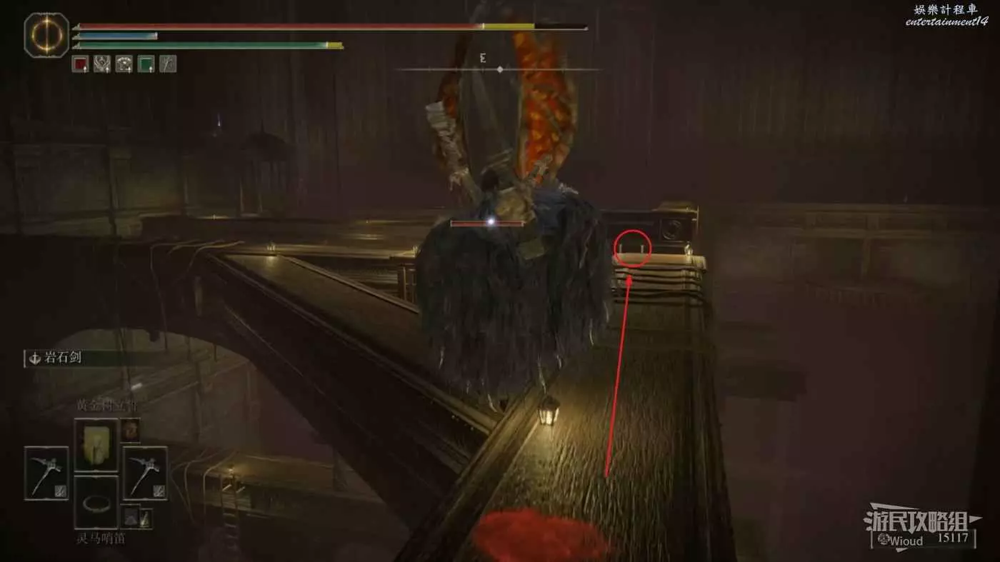 大橋的左前方有一個可以趴下去的樓梯,從這裡往下爬,然後順著邊緣陸地往左邊走。