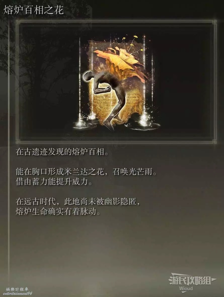 禱告就位於圓形遺跡內部大只花的旁邊,拾取這個光點就能獲得【熔爐百相之花】。