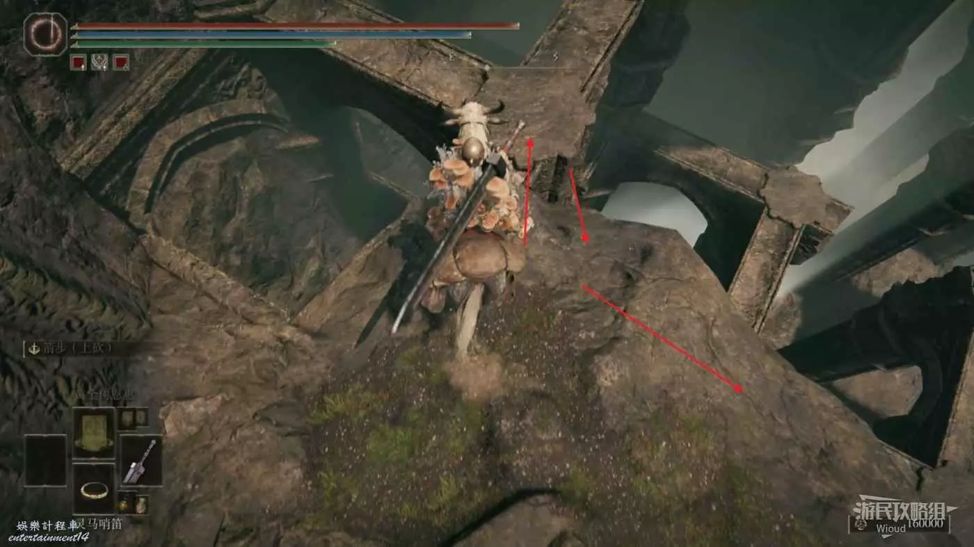 在上層沿著地圖右側斷掉的橋一直走然後跳到右邊的遺跡上。