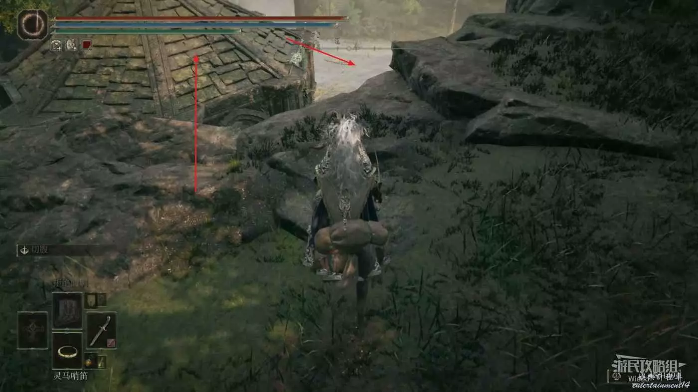 小心樓梯上的紅色跳彈,馬匹碰到可能會直接死亡,爬上樓梯往右走。