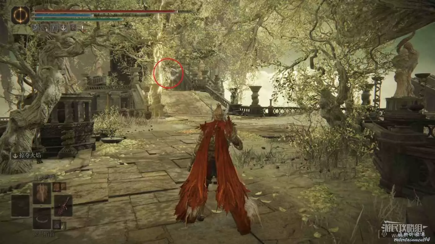此處可以看到左右兩邊各有一個圓形建築,我們往左側的那一個走,中間雕像的位置可以撿到一個【靈灰】。