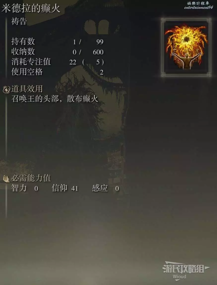 此禱告需要擊敗位於區域【穀底】的癲火之王,在大賜福使用追憶兌換獲得。