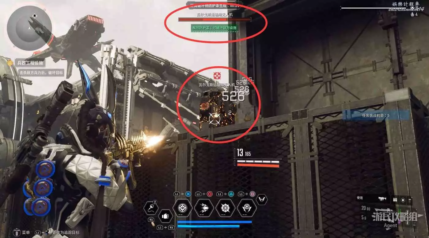 在兵器工程設施,先清理敵人,待運輸用無人機的防護罩解除後,才能攻擊運輸用無人機。