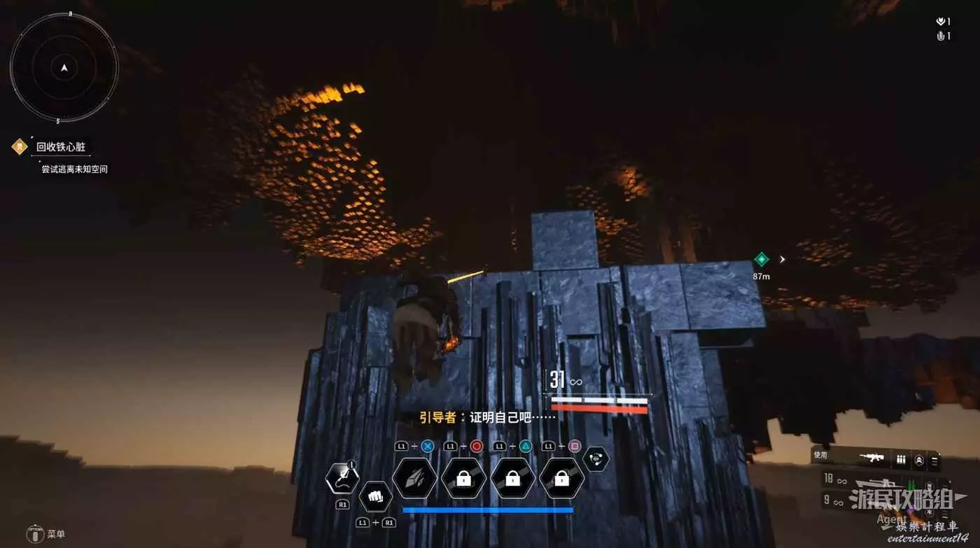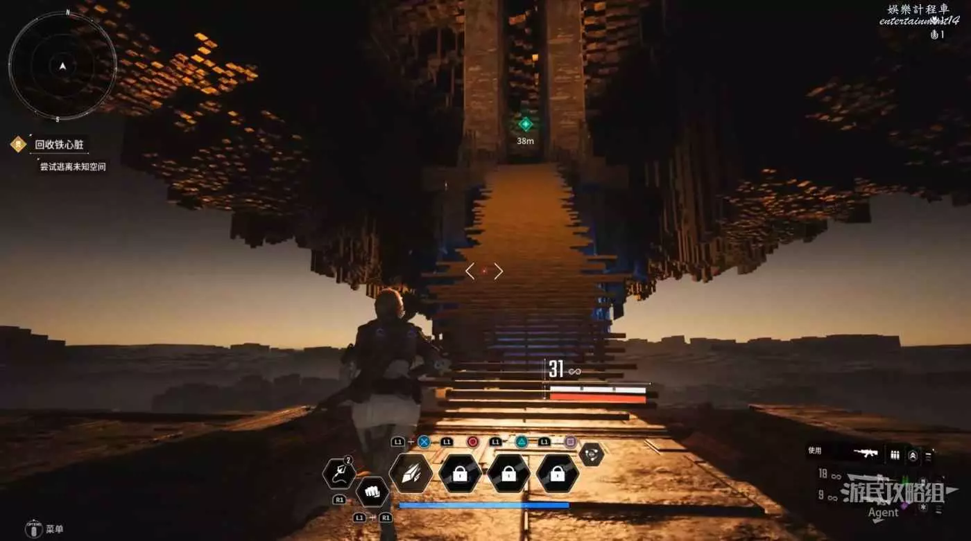 來到了未知空間,利用二段跳和抓鉤向高處前進。