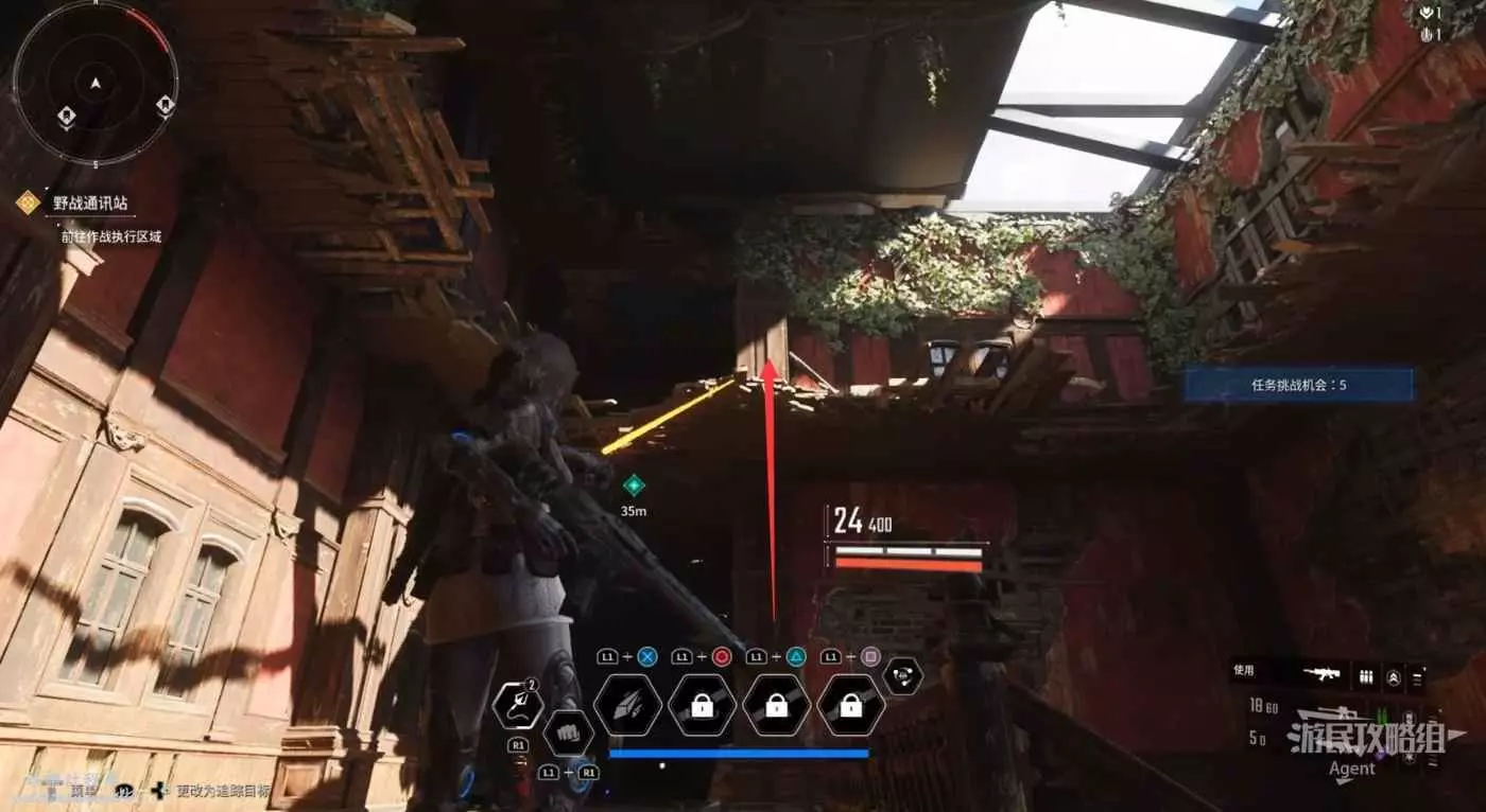 消滅敵人後,用抓鉤從上面的窗口出去。