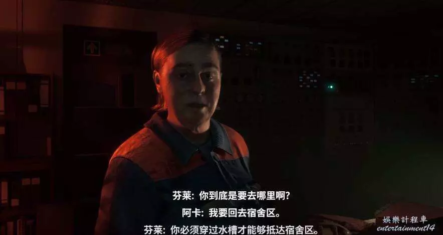 跟芬萊說話,她告知阿卡發生爆炸後,吉勃變得很異常,要回到宿舍區需要穿過水槽才行。