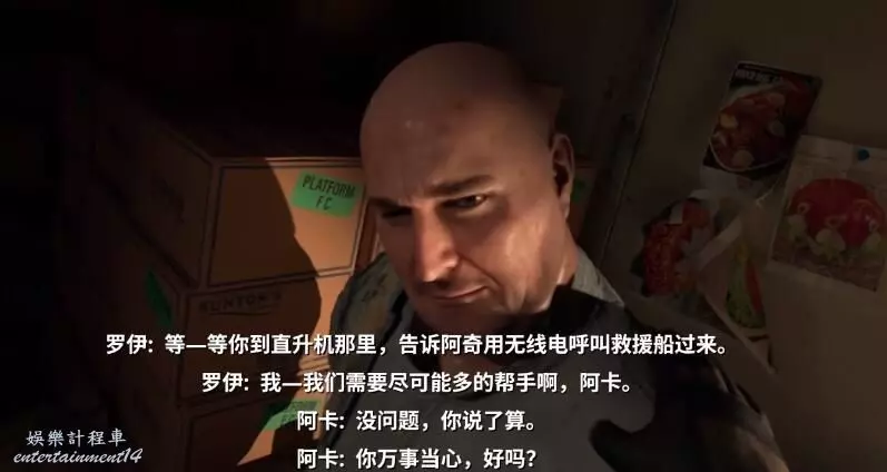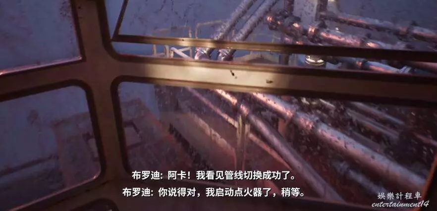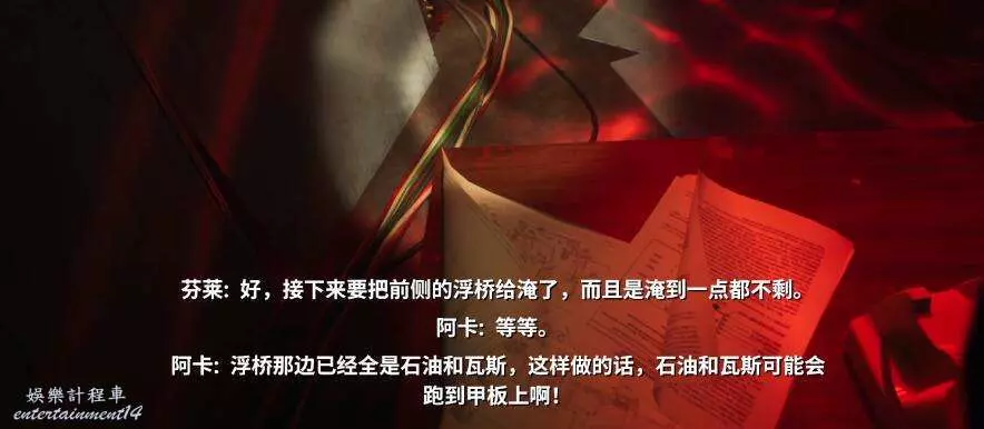 芬萊說接下來需要把浮橋淹沒,完成任務對話,芬萊說布羅迪有計劃讓阿卡去控制室找他們。