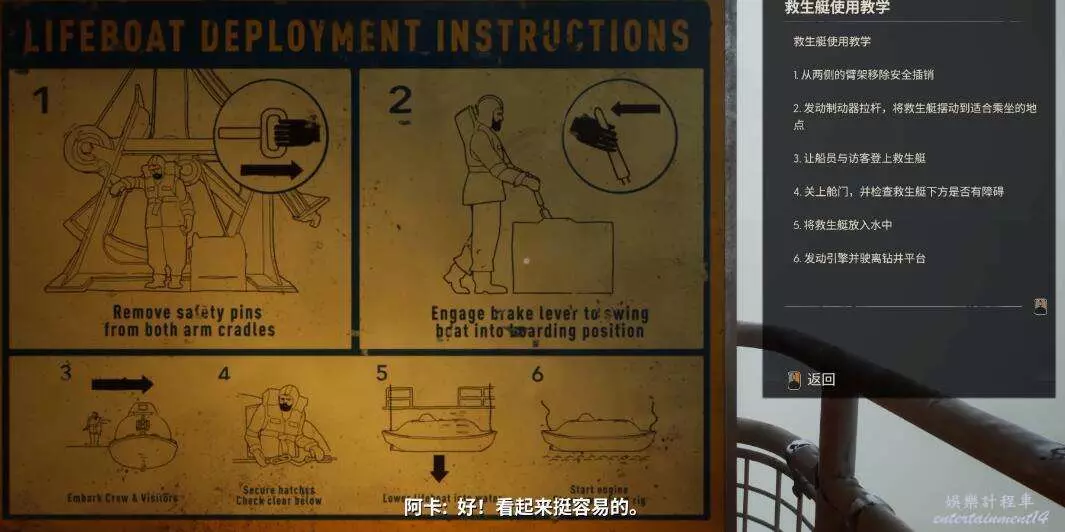 離開洗衣區到左舷,還好還有一架好的救生艇,查看使用教學將救生艇準備好。