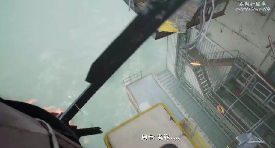 將隕落的直升機作為踏板,跳到對面的平台上,接到電話布魯斯說被水困住了。
