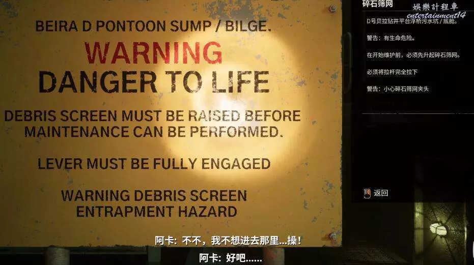 順著通道走,到達污泥處理區找到保險絲盒,修理好口開鎖離開。