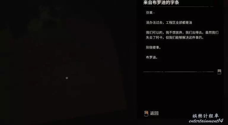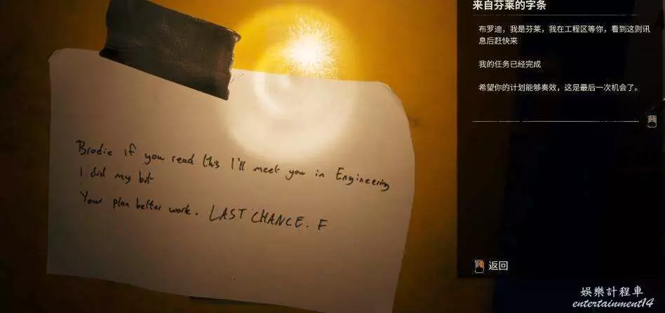 進入工程區看到布羅迪留給芬萊的字條,繼續往前,見到芬萊與之交流。