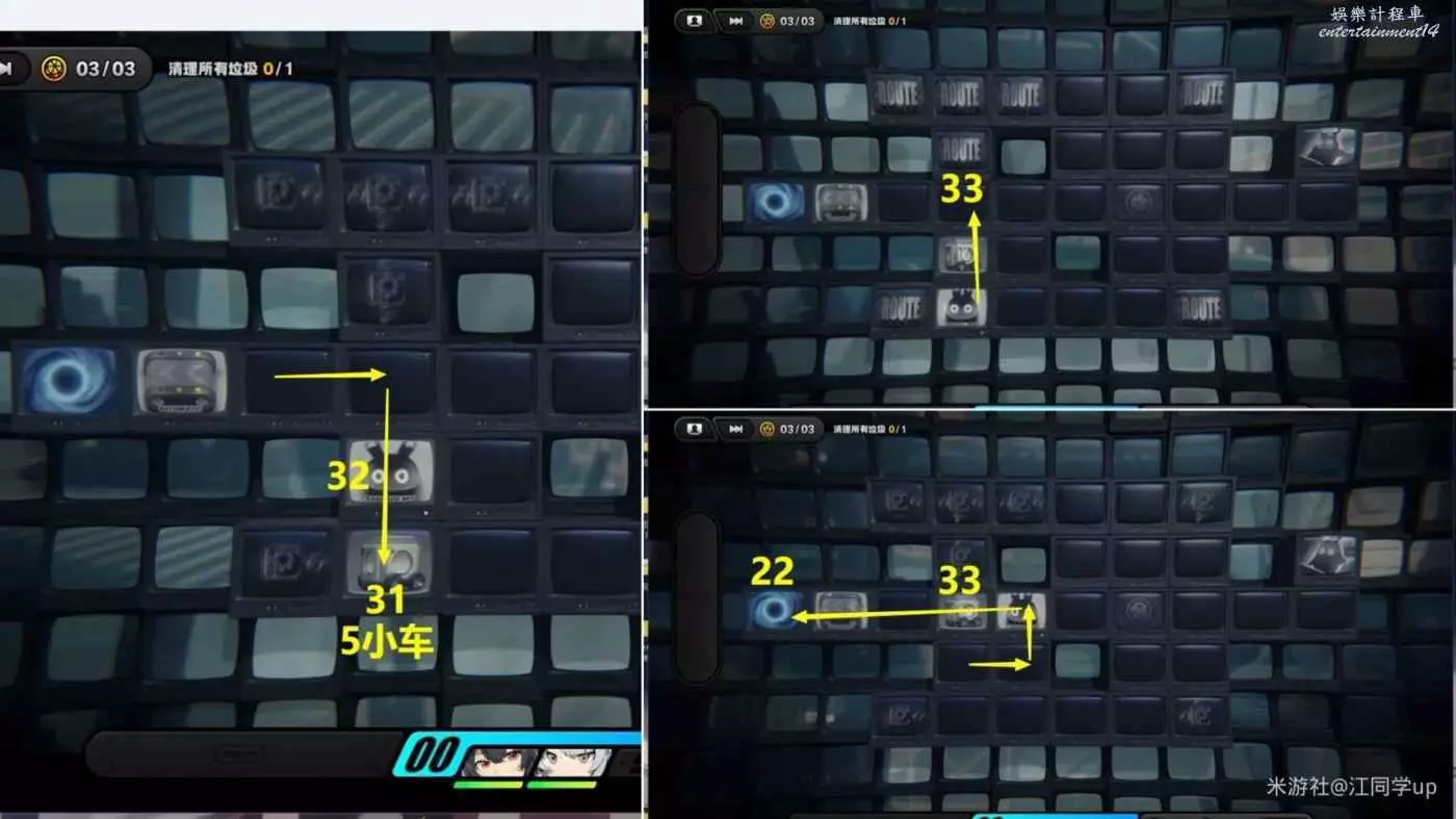(12)接著往31區域走,就會自動將5小車換到上面32區域,接著再將5小車推到33區域後,再從33區域右邊即可將5小車推進22區域裡面
