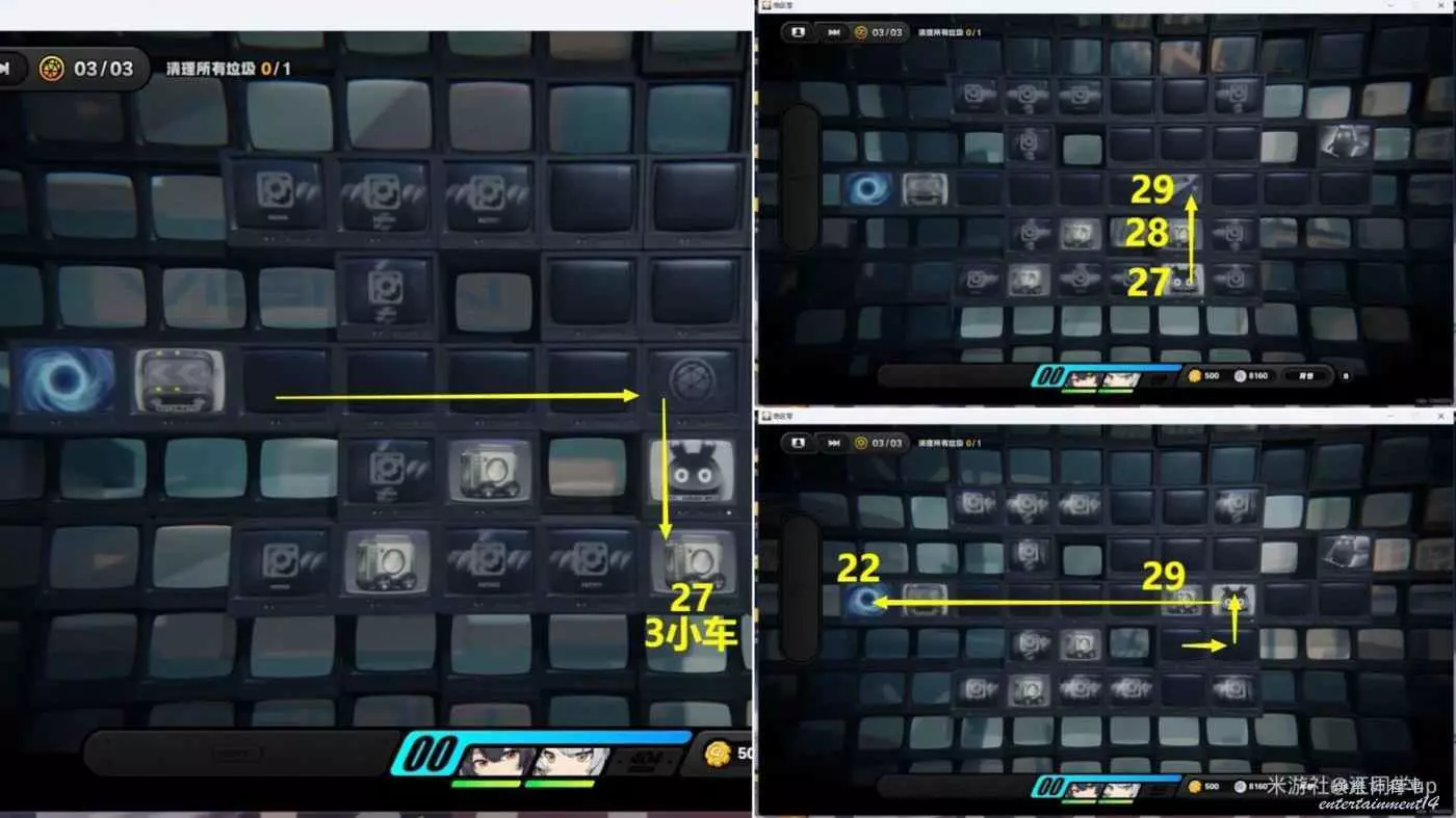 (10)接著往27區域走,就會自動將3小車換到上面28區域,接著再將3小車推到29區域後,再從29區域右邊即可將3小車推進22區域裡面