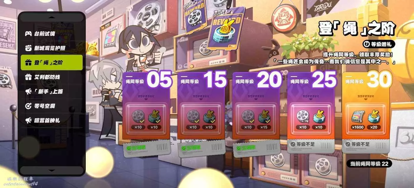 繩網等級達到5/15/20/25/30時可領取獎勵。