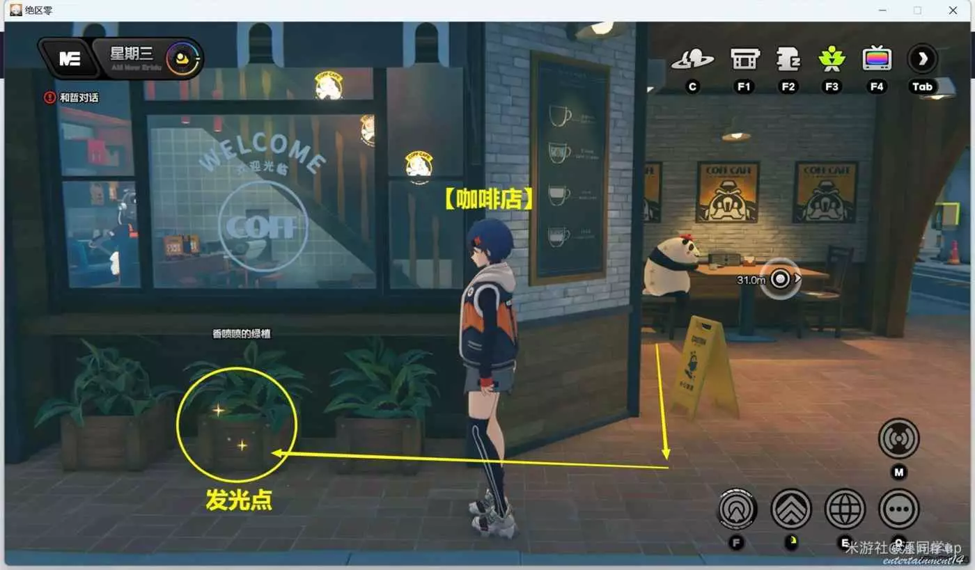 (1)上午時間段,點擊【咖啡店】傳送過去後,來到下圖位置調查【香噴噴的綠植】後,即可獲得1個【調查協會紀念幣】,注意【香噴噴的綠植】上必須有一閃一閃的發光點,調查後才會有紀念幣