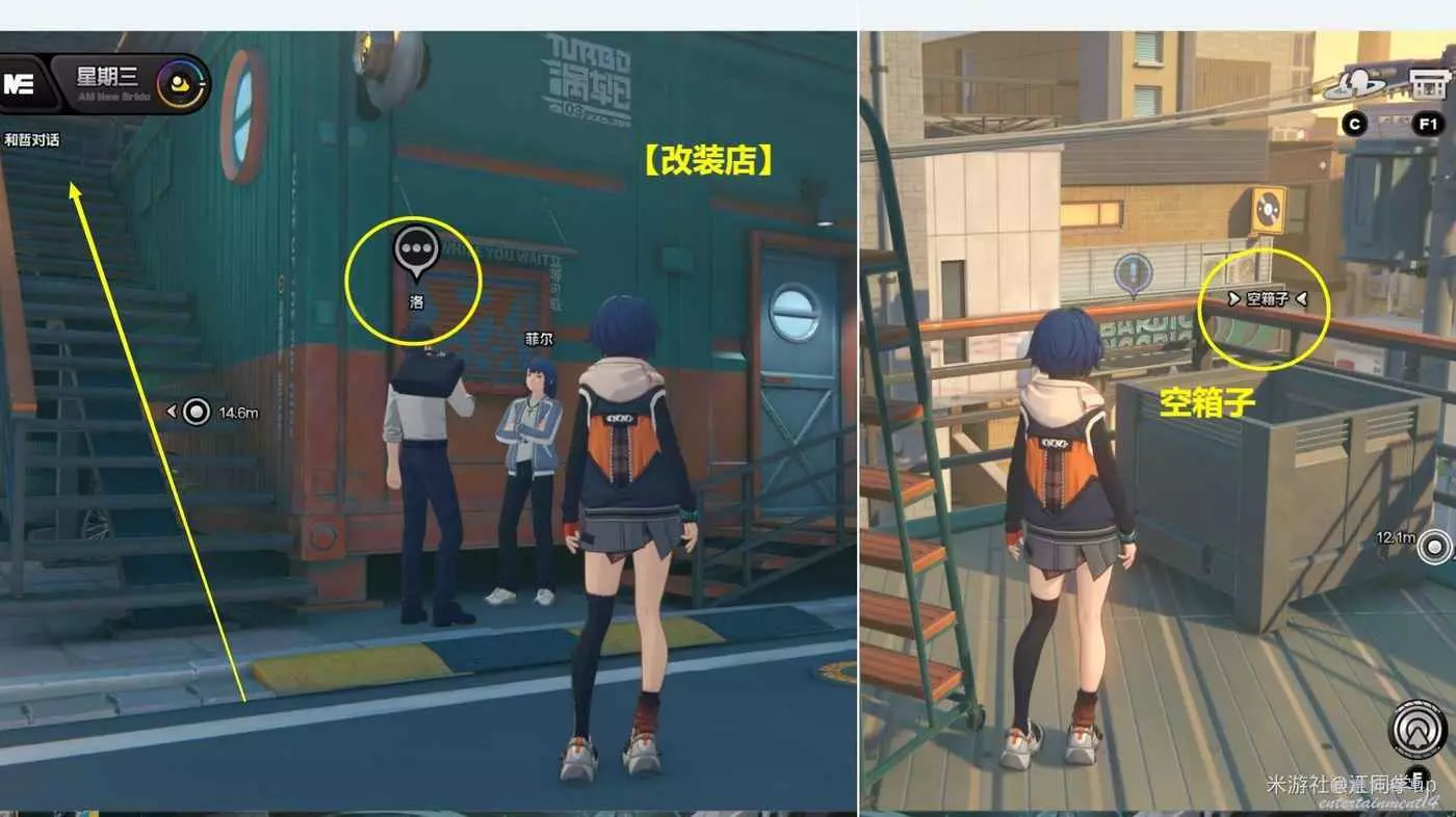 (1)上午時間段,,點擊【改裝店】傳送過去後,和【改裝店】門口的【洛】對完話後,從旁邊的樓梯上去調查上面的【空箱子】後,即可獲得1個【調查協會紀念幣】,注意【洛】頭頂必須有3個灰色點,對話後才能獲取到紀念幣