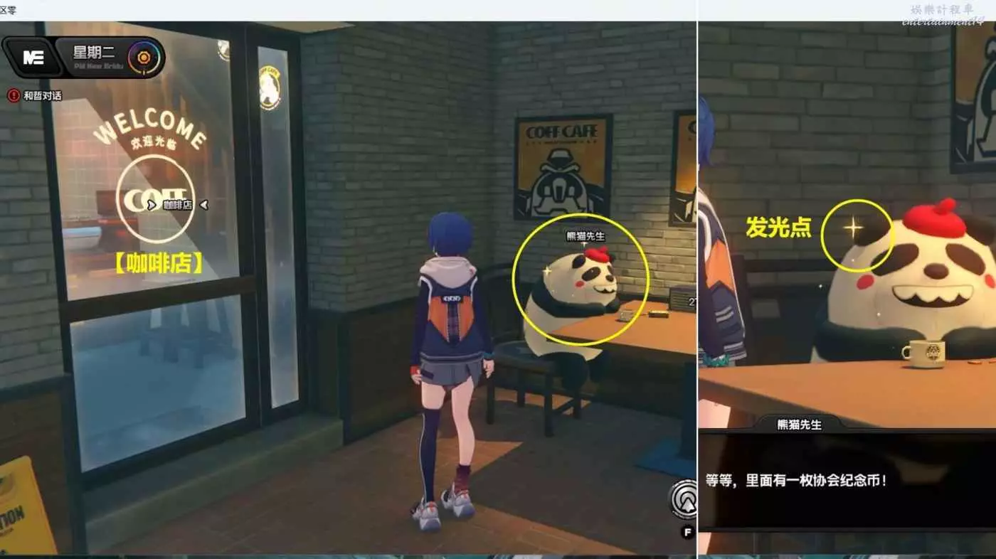 (1)下午時間段,點擊【咖啡店】傳送過去後,和【咖啡店】門口的【熊貓先生】對完話後,即可獲得1個【調查協會紀念幣】,注意【熊貓先生】身上必須有一閃一閃的發光點,對話後才會有紀念幣