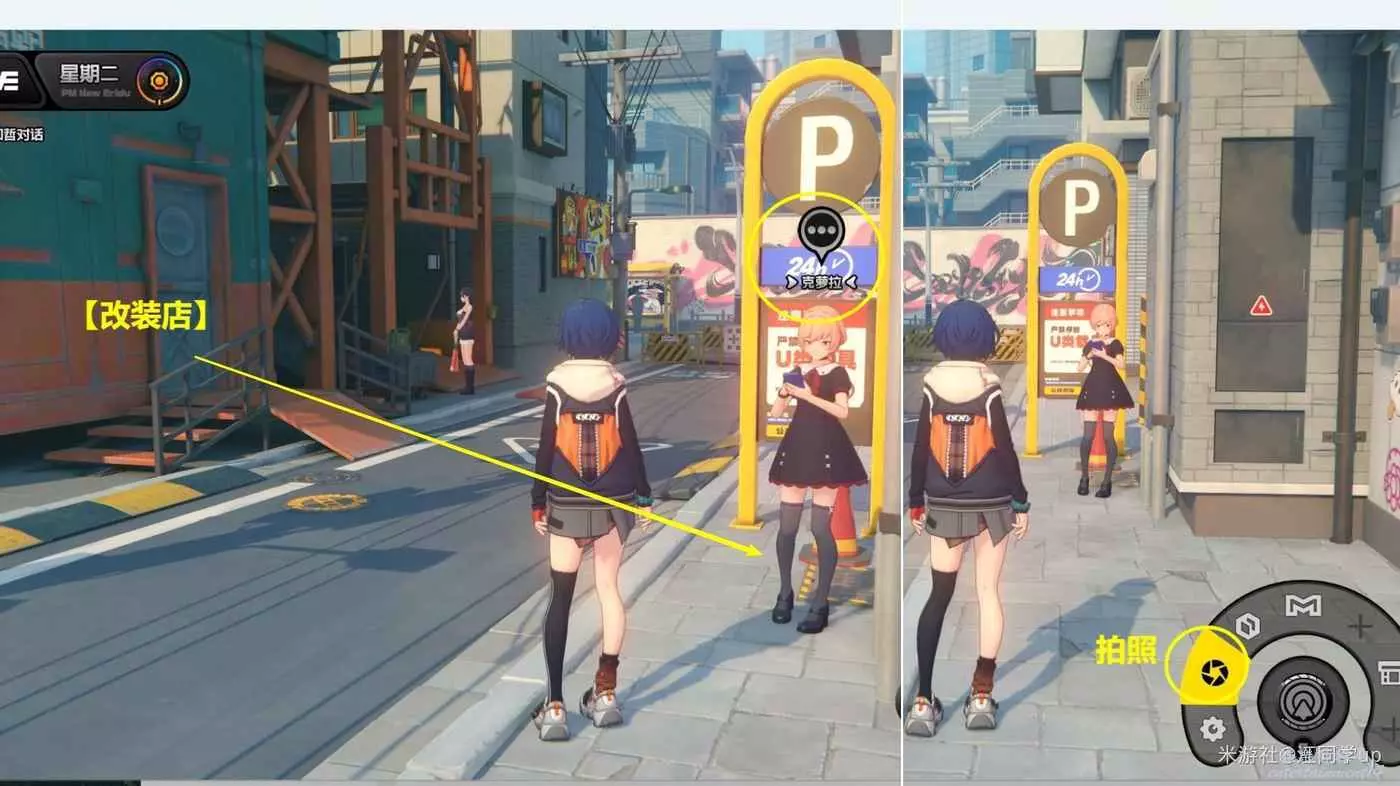 (1)下午時間段,點擊【改裝店】傳送過去後,來到下圖位置先和【克蘿拉】完成第1次對話,然後長按F鍵後選擇【拍照】,給【克蘿拉】拍張照片後,再次和【克蘿拉】對完話後,即可獲得1個【調查協會紀念幣】,注意【克蘿拉】頭頂必須有3個灰色點,對話後才能獲取到紀念幣