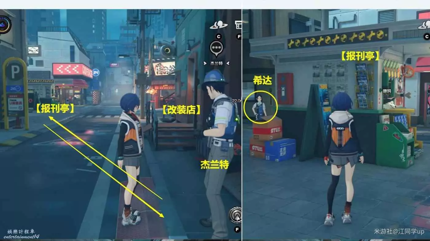 (1)淩晨時間段,點擊【改裝店】傳送過去後,來到下圖位置先和【傑蘭特】完成第1次對話,接著去和【報刊亭】後面的【希達】對完話,然後再次回去和【傑蘭特】對完話後,即可獲得1個【調查協會紀念幣】,注意【傑蘭特】頭頂必須有3個灰色點,對話後才能獲取到紀念幣