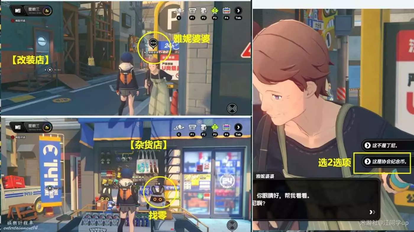 (1)上午時間段,,點擊【改裝店】傳送過去後,和【改裝店】對面的【雅妮婆婆】完成第1次對話,對話最後選擇第2個選項【這是協會紀念幣】,然後去和【雜貨店】門口的【找零】對完話,最後再回去和【雅妮婆婆】對完話後,即可獲得1個【調查協會紀念幣】,注意【克蘿拉】頭頂必須有3個灰色點,對話後才能獲取到紀念幣