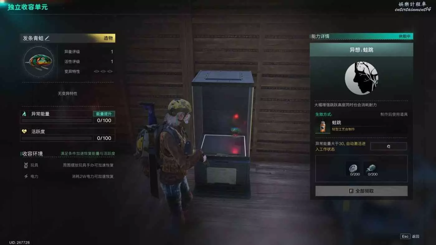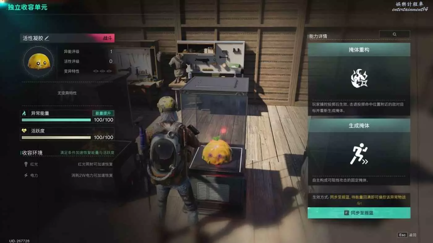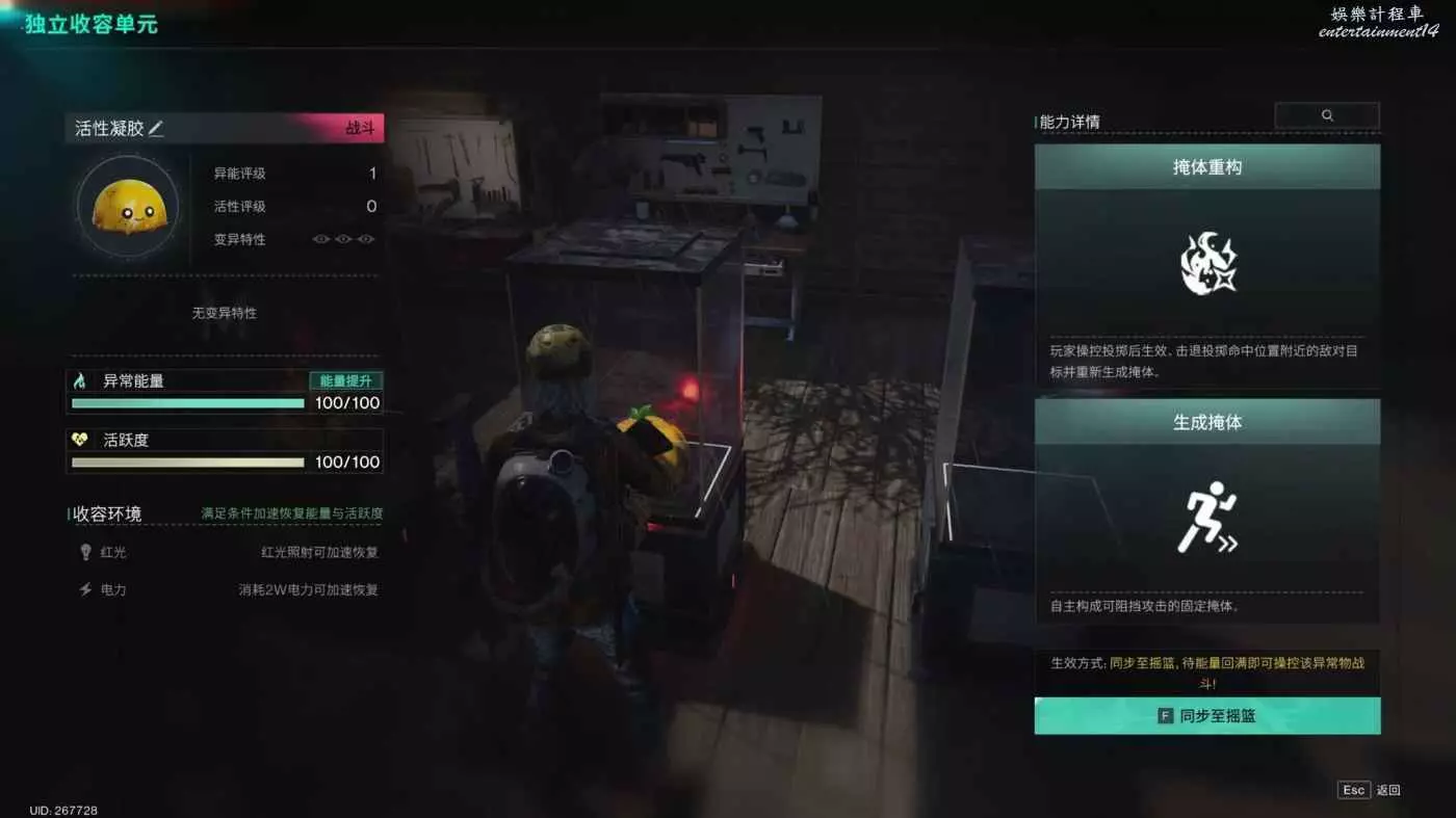 左側為異常物基礎資訊與異常物收容環境。達成收容環境條件可以加速該異常物的能量恢復與活躍度