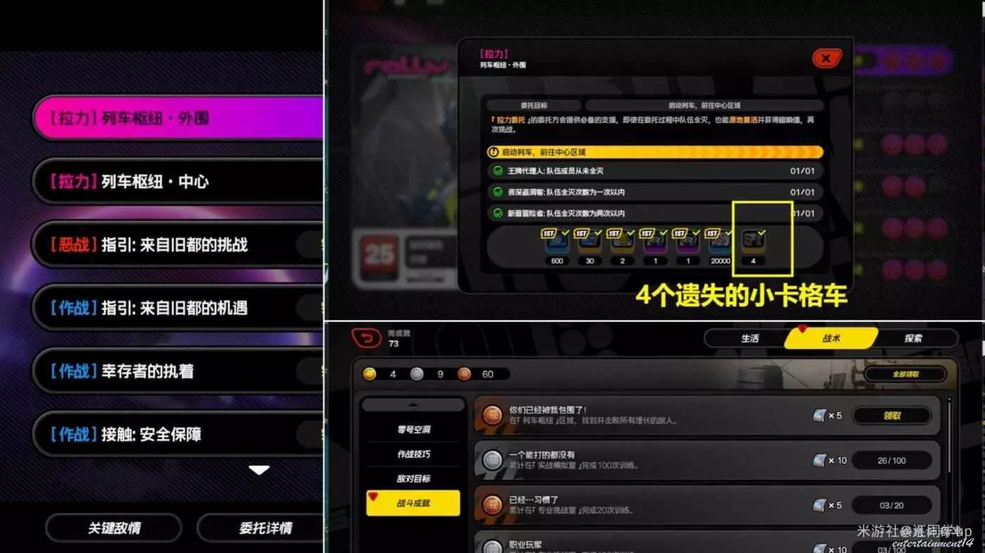 絕區零 (Zenless Zone Zero) 列車樞紐週邊卡格車位置分享 10 7 月 2024-07-10 廣告 作者:江同學up 來源:米遊社論壇 注釋說明 (1)副本是可以重複進的,所以副本獎勵沒拿完的可以重新進去拿,該副本有4個遺失的小卡格車 (2)首先該任務需要最少23級,並且主線做到第2章後,就會自動接到【戰鬥委託-列車樞紐·週邊】 (3)如果你下面【委託詳情】裡面【4個遺失的小卡格車】都拿到(打綠色√)和拿到成就《你們已經被我包圍了》了,那麼就說明【戰鬥委託-列車樞紐·週邊】你已經做完了 (4)其中【4個遺失的小卡格車】跟著任務提示走就能全部拿完。 4個遺失的小卡格車位置