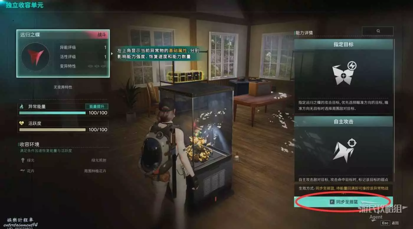 再次和蝶對話後,打開收容單元,將異常物“遠歸之蝶”同步至搖籃(其實就是你背上背的包)。