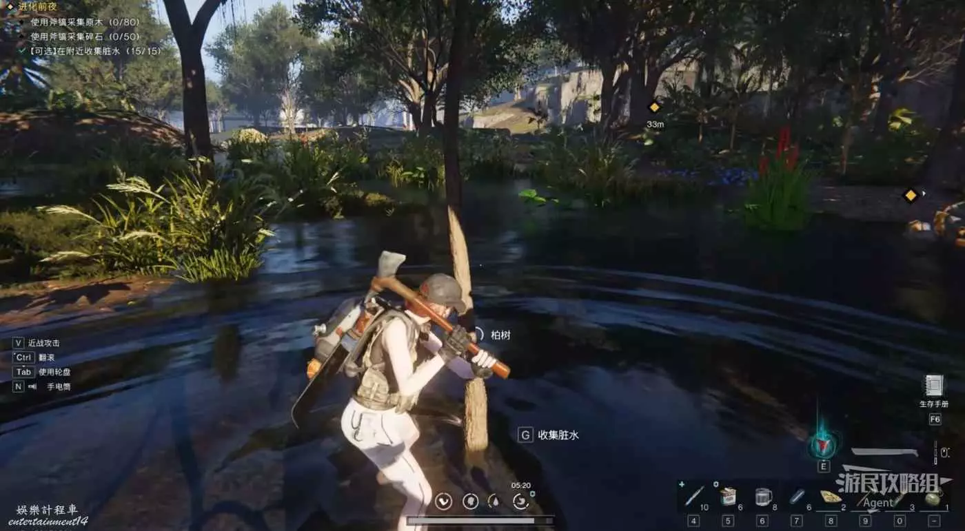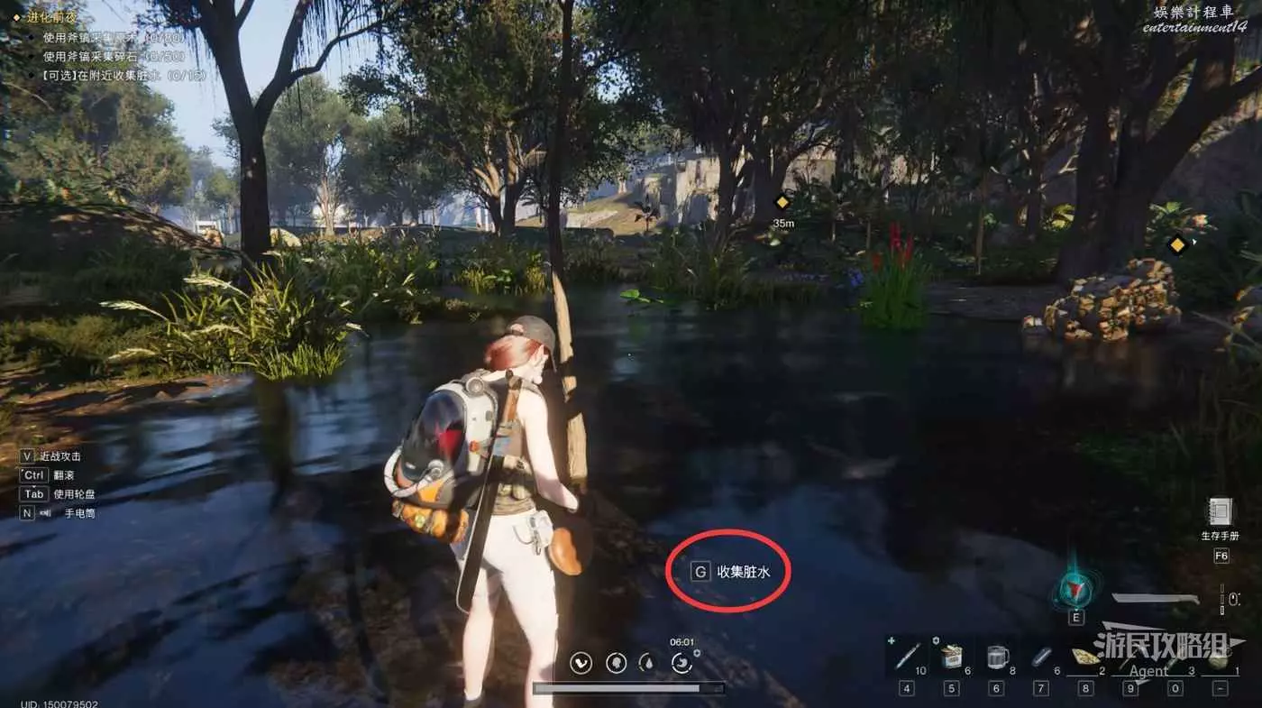 站在水池裡收集髒水,等下作為製作可以喝的水的材料之一。