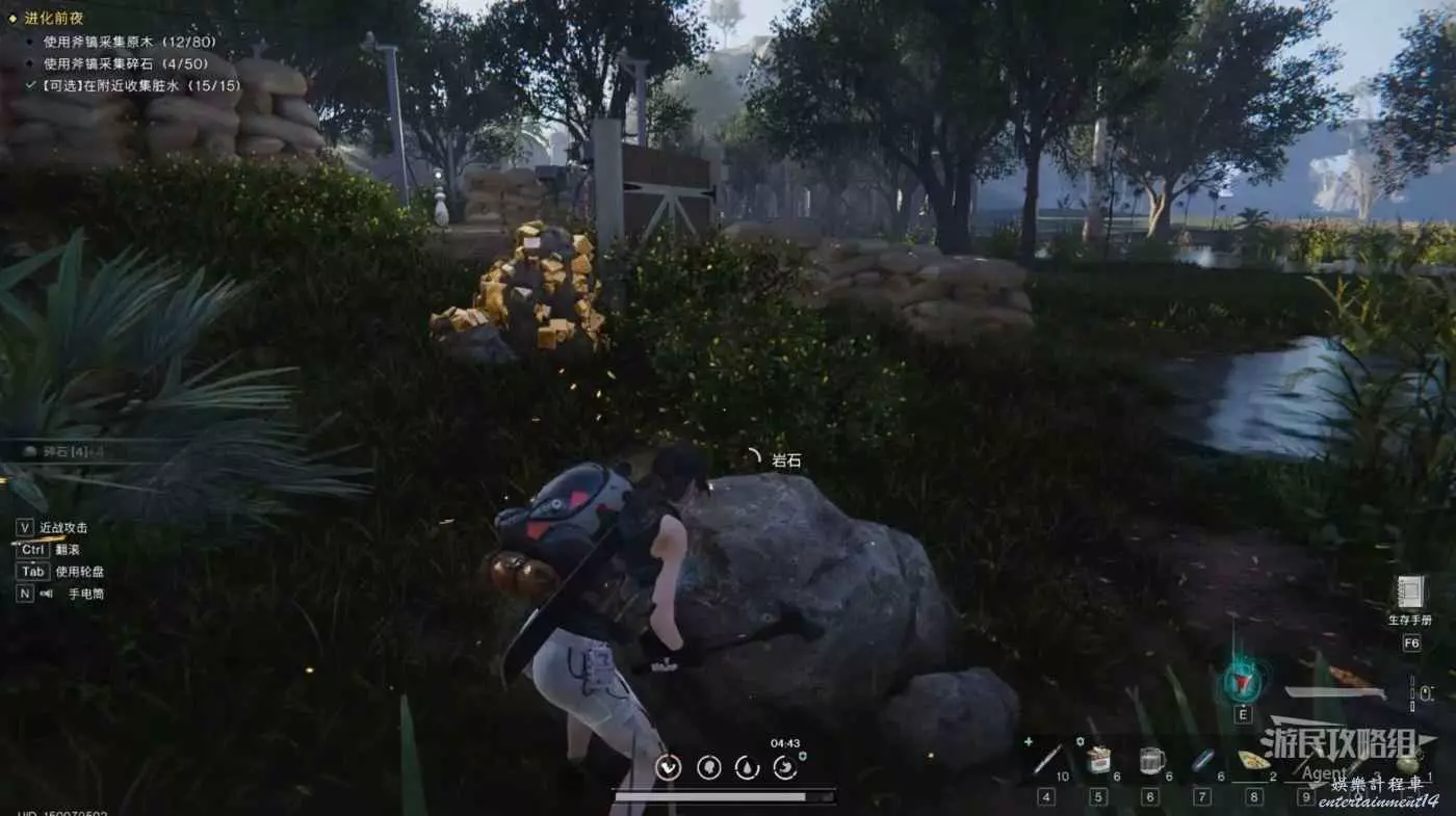 然後用斧子砍樹、砍石頭,獲得原木和碎石。